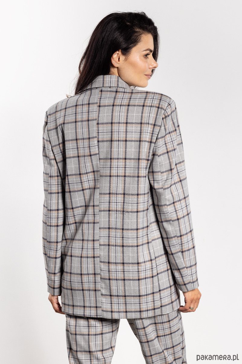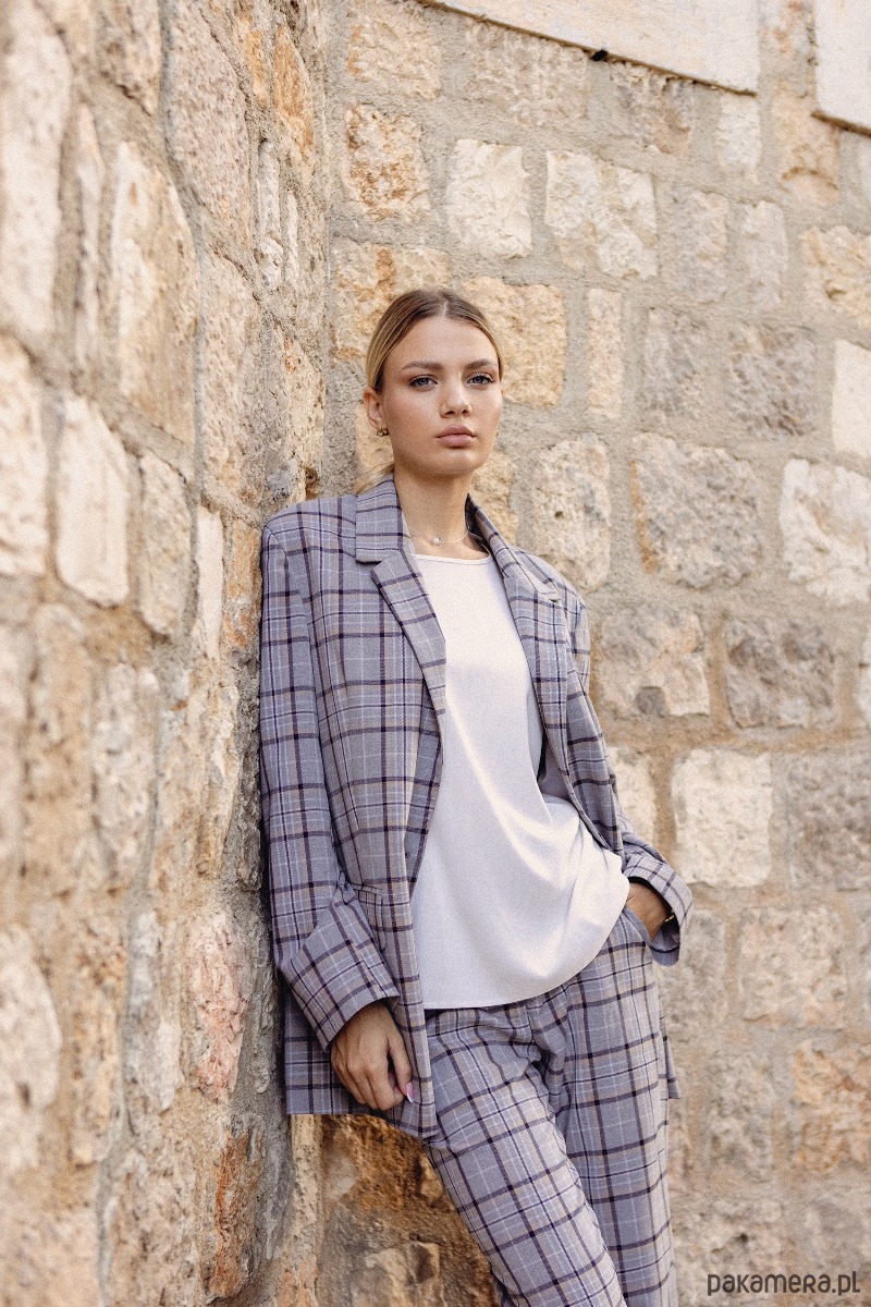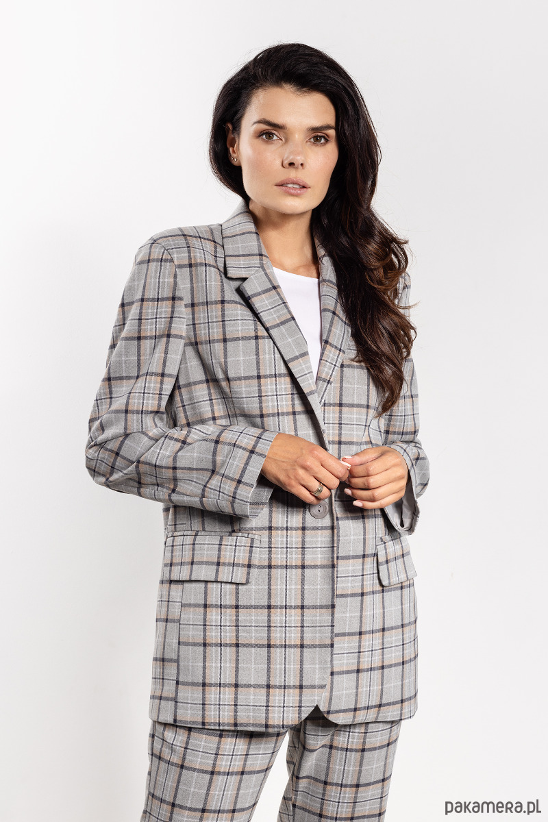 Elegancka marynarka damska w kratę o luźnym fasonie oversize łączy komfort i ponadczasowy styl. Klasyczny kołnierz z klapami i zapięcie na guzik podkreślają formalny charakter, a luźny krój zapewnia swobodę ruchów. Model doskonale komponuje się z eleganckimi spodniami, spódnicą lub casualowymi jeansami, sprawdzając się w pracy, na spotkaniach biznesowych oraz podczas codziennych stylizacji. Praktyczne kieszenie z klapką dodają funkcjonalności i nowoczesnego akcentu.