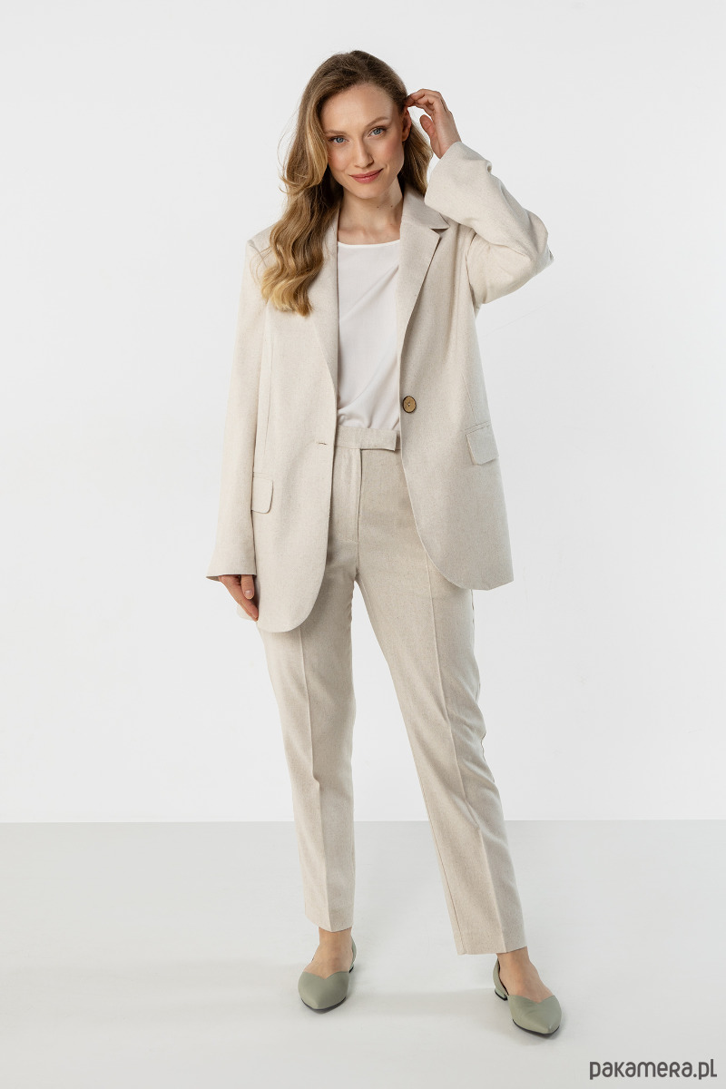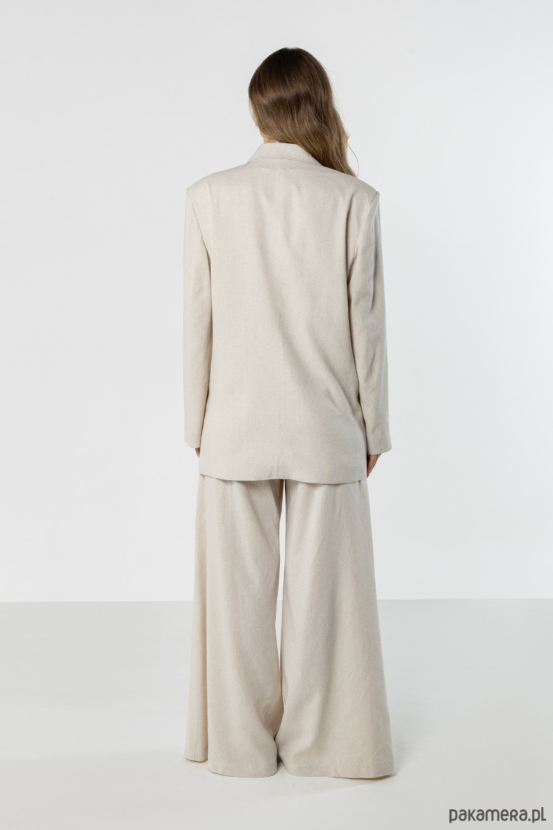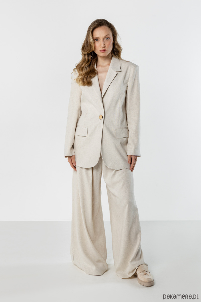 Marynarka w jasnym, naturalnym odcieniu beżu o eleganckim, lekko oversize’owym kroju. Model z klasycznymi klapami i kieszeniami pięknie układa się na sylwetce, dodając stylizacji lekkości i ponadczasowego charakteru.
