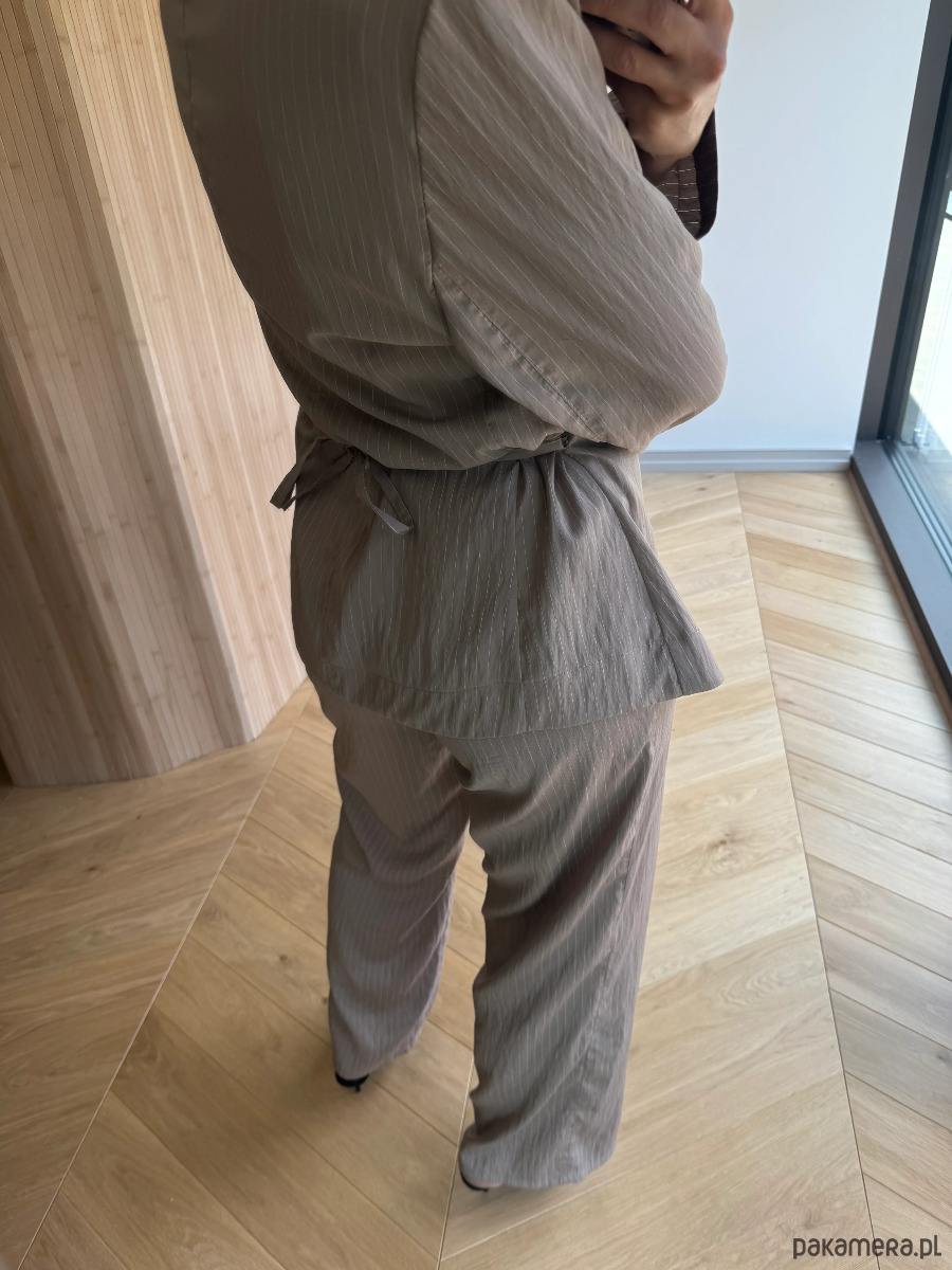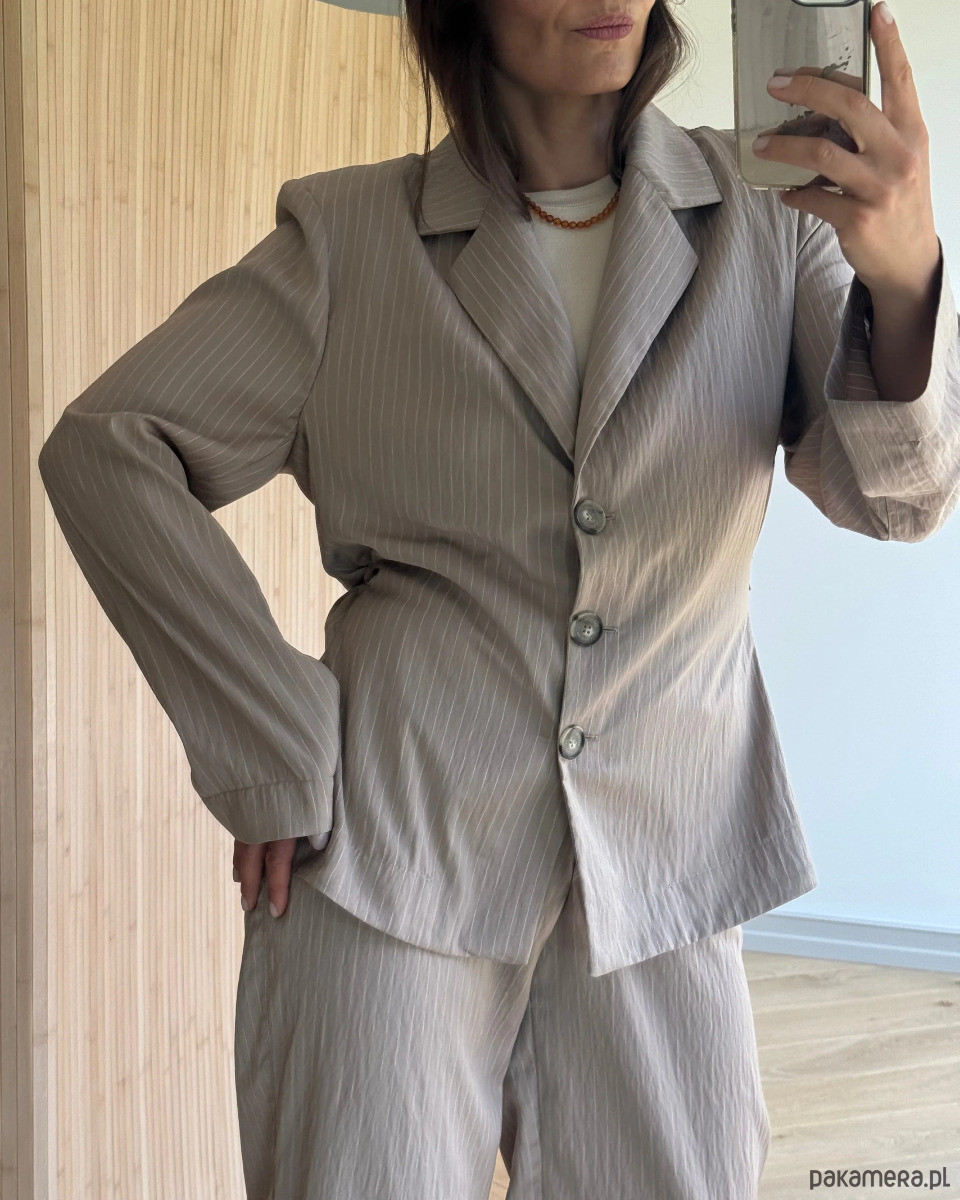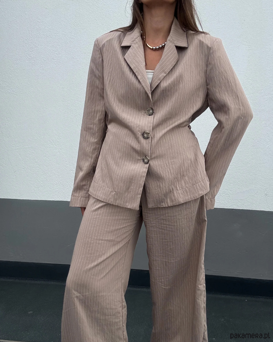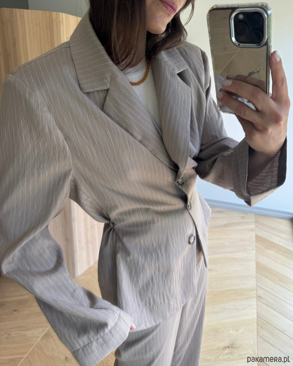 Marynarka Wonder w odcieniu taupe to doskonała propozycja na sezon wiosna–lato dla kobiet, które szukają stylowego, ale wygodnego okrycia na cieplejsze dni. Wykonana z przewiewnego modalu o delikatnej fakturze w prążki, zapewnia naturalną cyrkulację powietrza i subtelny połysk. Dzięki dopasowanemu krojowi i marszczeniu talii, marynarka pięknie modeluje sylwetkę, nie tracąc przy tym luzu i lekkości letniego stylu.