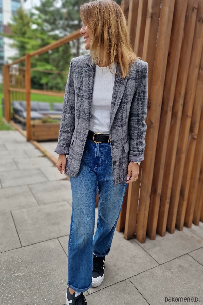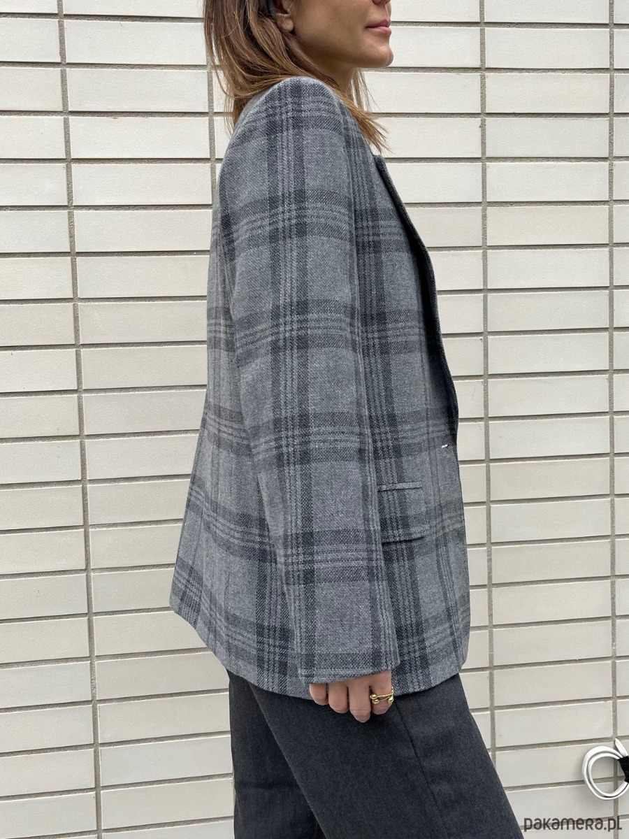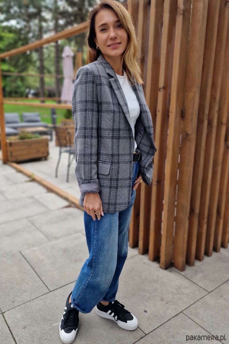 Klasyczna, wełniana marynarka w kolorze szarym w grafitową kratę. Fason luźny. Na wiskozowej podszewce. Bardzo starannie uszyta z najwyższej jakości wełny, pochodzącej od polskiego producenta. Idealnie nadaje się do wielu stylizacji, na formalne okazje, do eleganckiego obuwia oraz na codzień, do luźnych spodni, dżinsów i adidasów. Może być noszona jako okrycie wierzchnie, również z paskiem. Marynarka Liv jest przyjemna w dotyku i nie drapie. To ubranie, które nigdy nie wyjdzie z mody i będzie Ci służyć przez lata. Uszyta w kameralnej pracowni pod Warszawą. Występuje w dwóch rozmiarach: XS/S oraz M/L.