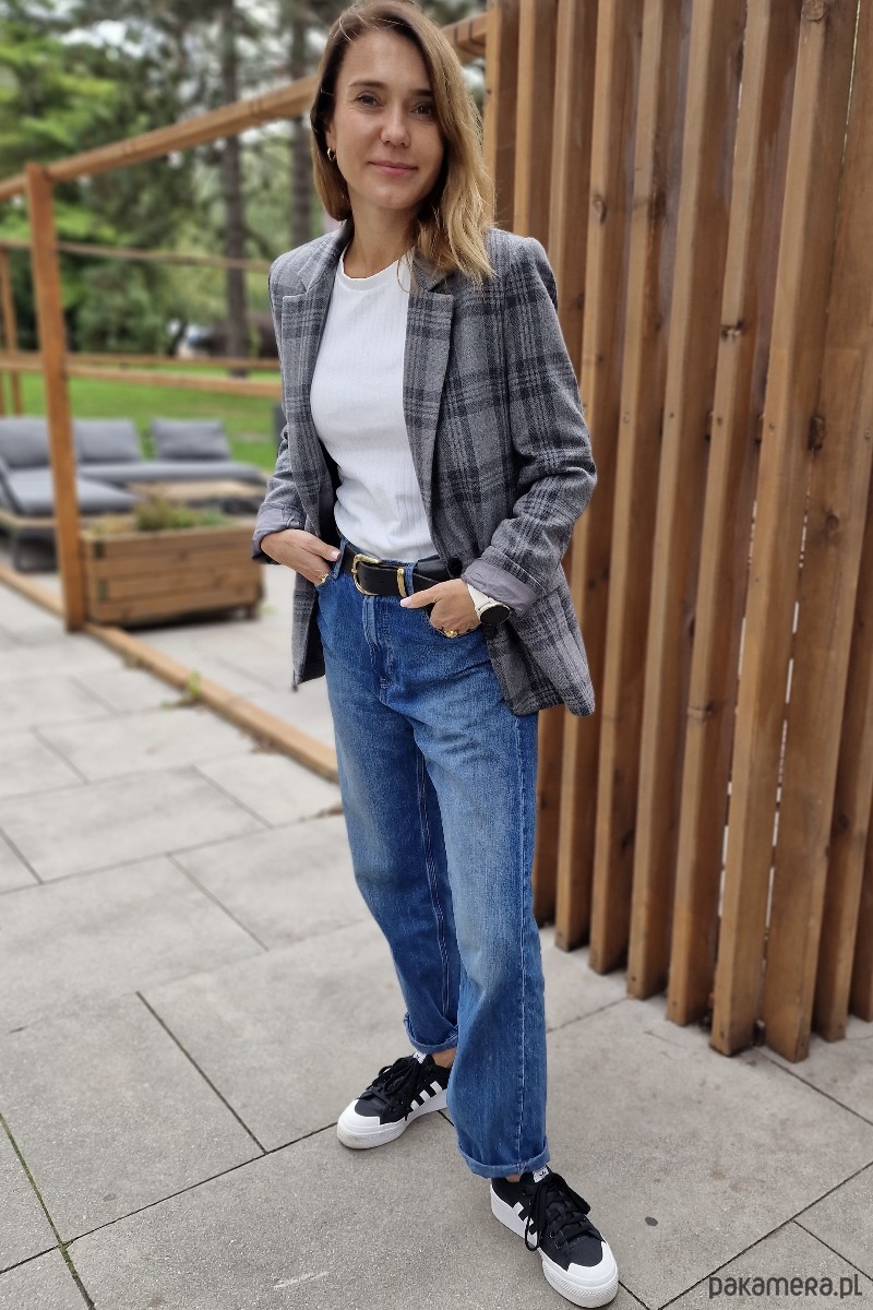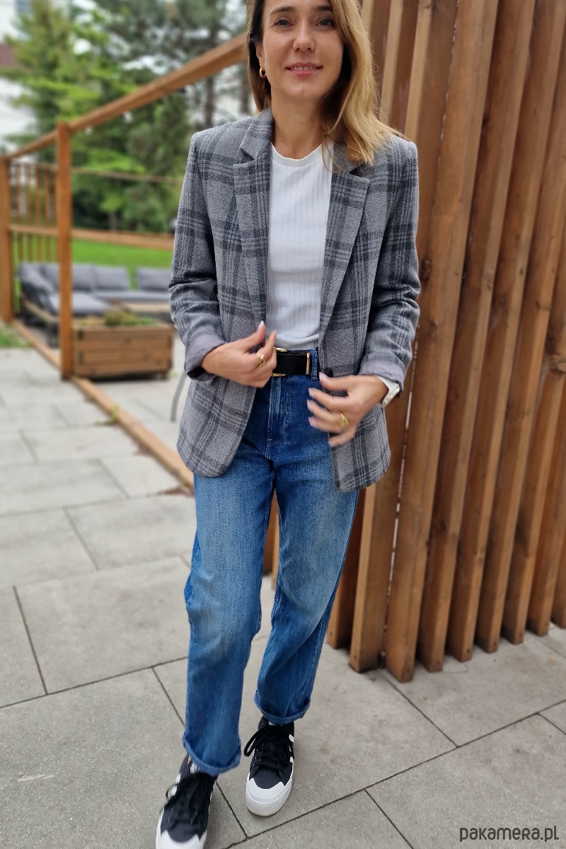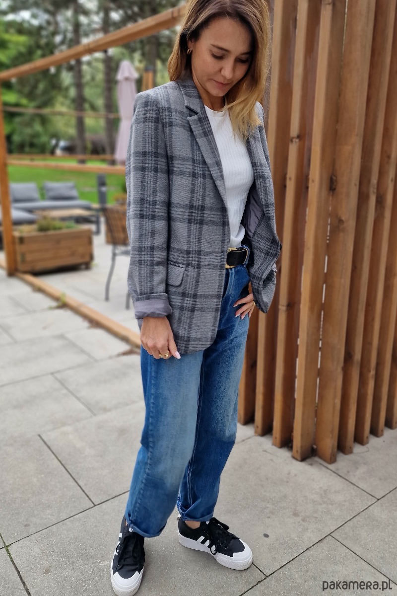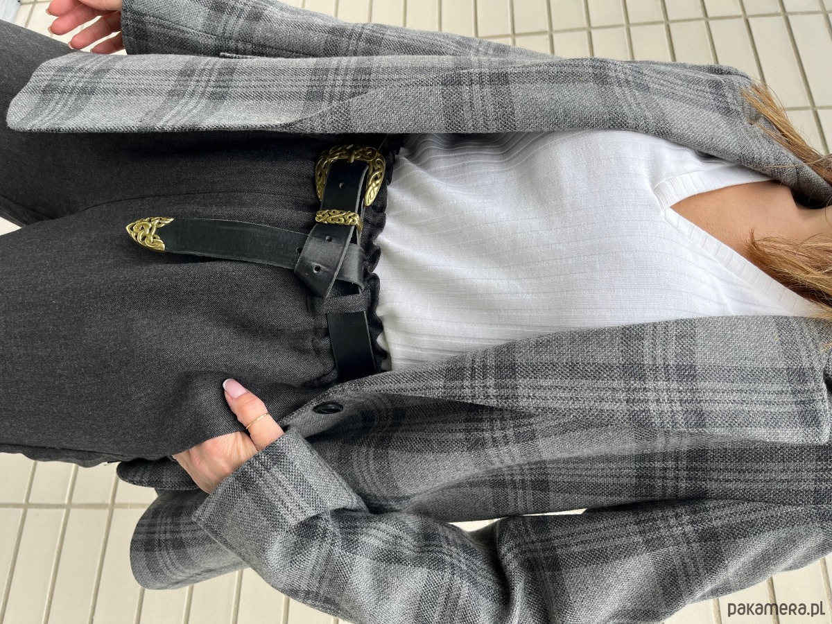 Klasyczna, wełniana marynarka w kolorze szarym w grafitową kratę. Fason luźny. Na wiskozowej podszewce. Bardzo starannie uszyta z najwyższej jakości wełny, pochodzącej od polskiego producenta. Idealnie nadaje się do wielu stylizacji, na formalne okazje, do eleganckiego obuwia oraz na codzień, do luźnych spodni, dżinsów i adidasów. Może być noszona jako okrycie wierzchnie, również z paskiem. Marynarka Liv jest przyjemna w dotyku i nie drapie. To ubranie, które nigdy nie wyjdzie z mody i będzie Ci służyć przez lata. Uszyta w kameralnej pracowni pod Warszawą. Występuje w dwóch rozmiarach: XS/S oraz M/L.