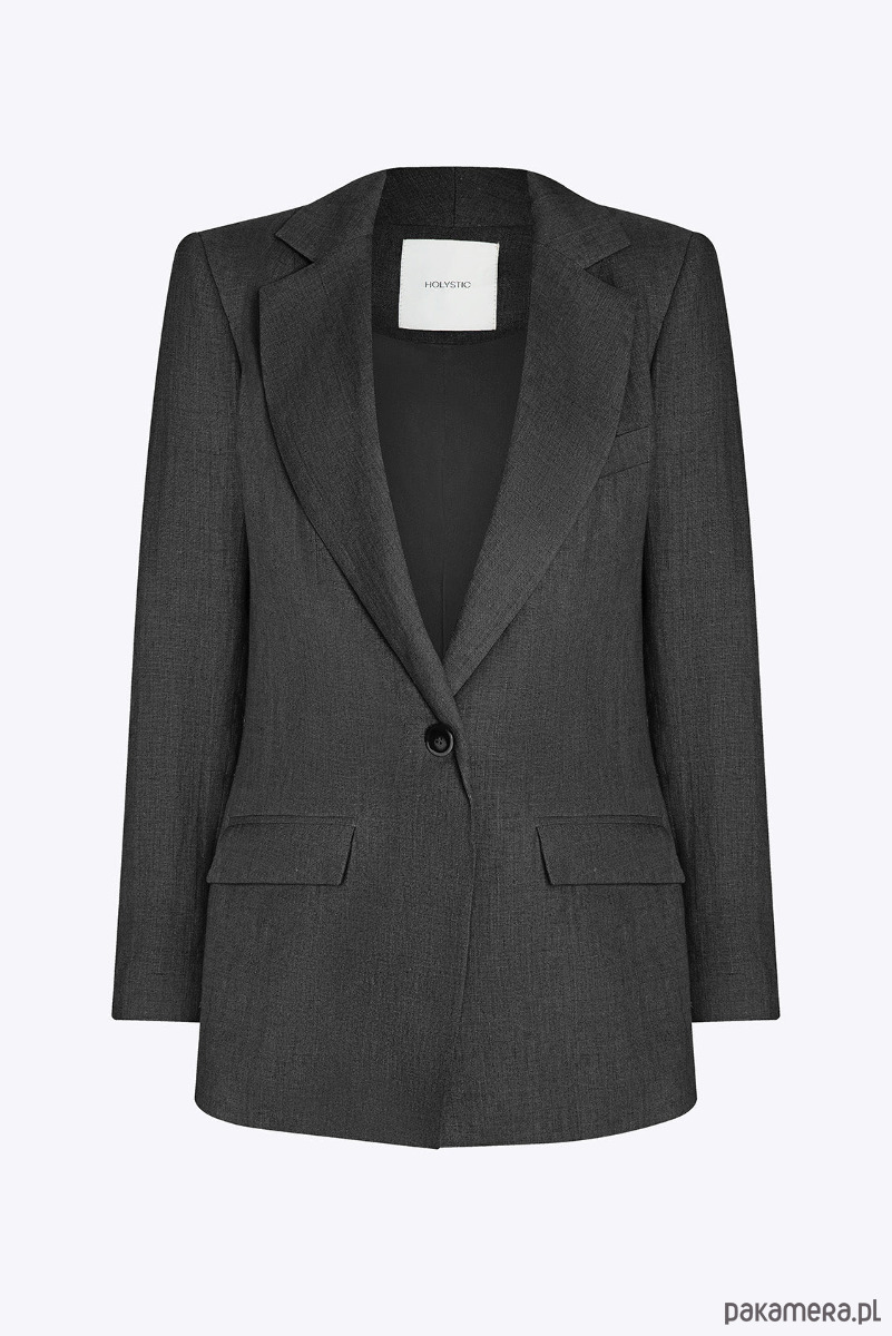 Lniana marynarka jednorzędowa damska jest uszyta z polskiego lnu z certyfikatem, posiada wiskozową podszewkę, co zapewnia przewiewność i komfort w noszeniu. Marynarka o klasycznym taliowanym fasonie, zapinana na guzik to ponadczasowy niezbędnik szafy kapsułowej.