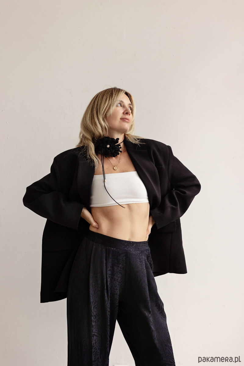 Klasyka gatunku, czyli czarna marynarka oversize z guzikami i podszewką.
