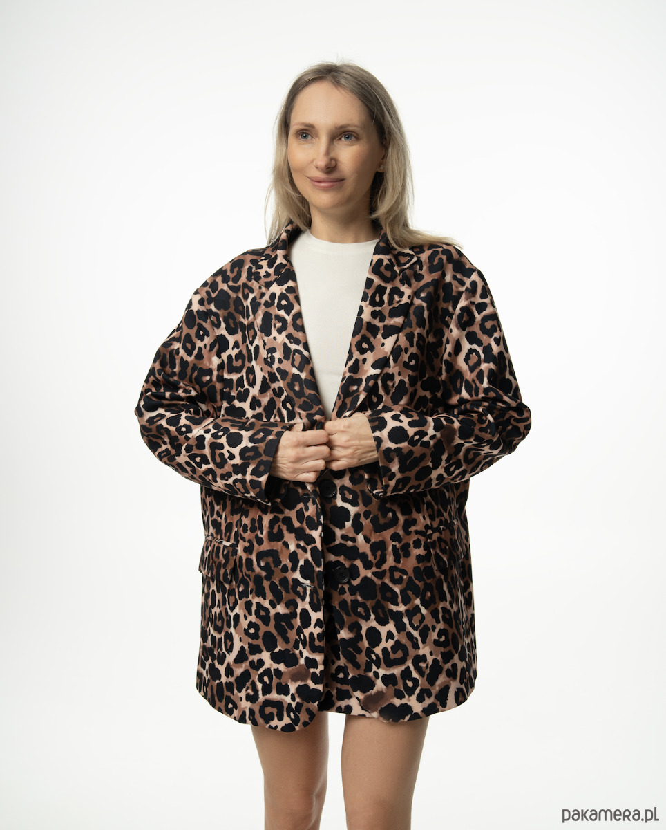 Marynarka damska „Panterka” to elegancka propozycja dla kobiet, które cenią nowoczesną klasykę i wyrazisty styl. Luźniejszy, komfortowy krój zapewnia swobodę ruchów, jednocześnie zachowując elegancką linię sylwetki. Wyrazisty wzór nadaje marynarce charakteru i sprawia, że staje się mocnym akcentem stylizacji.