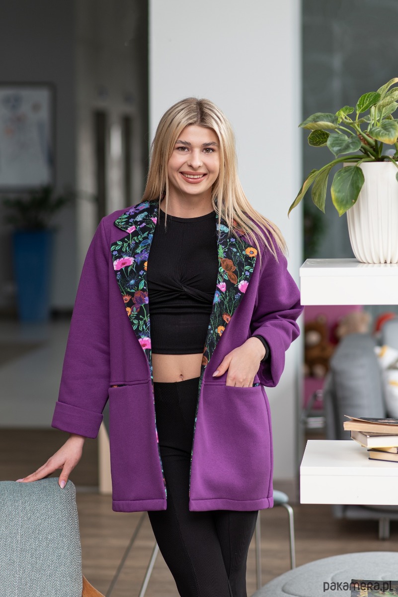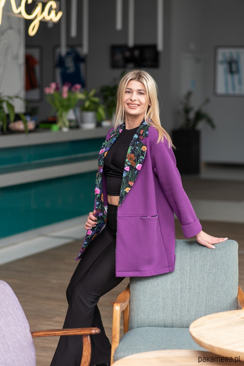 Marynarka na każdą okazję. Uszyta z dresówki drapanej 280 gr. Kołnierz, oraz wewnętrzna część kieszonki wykonana z ozdobnego printu.Prosty modny krój.