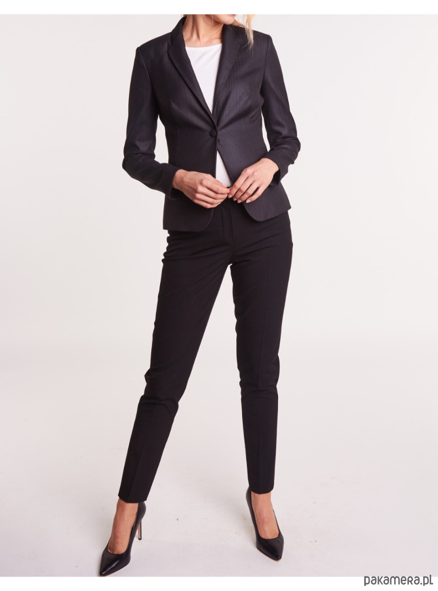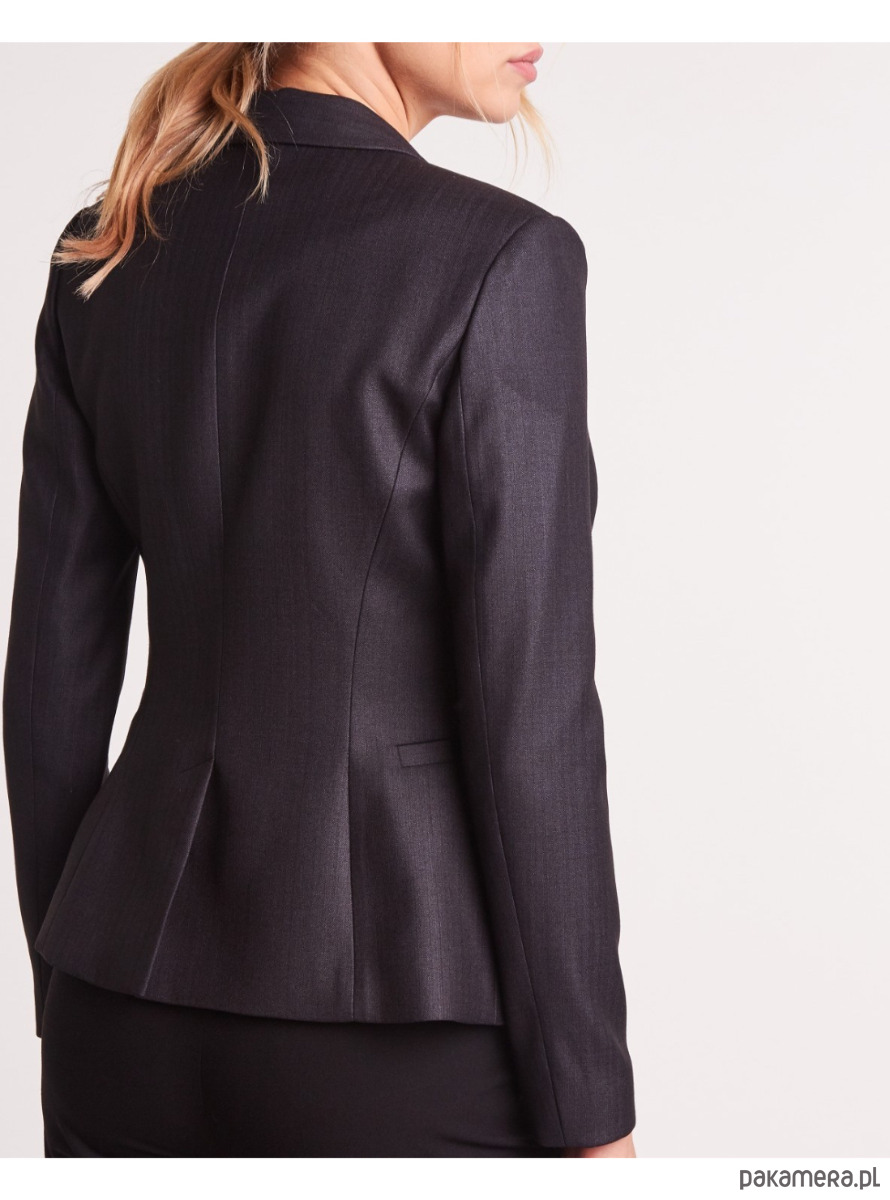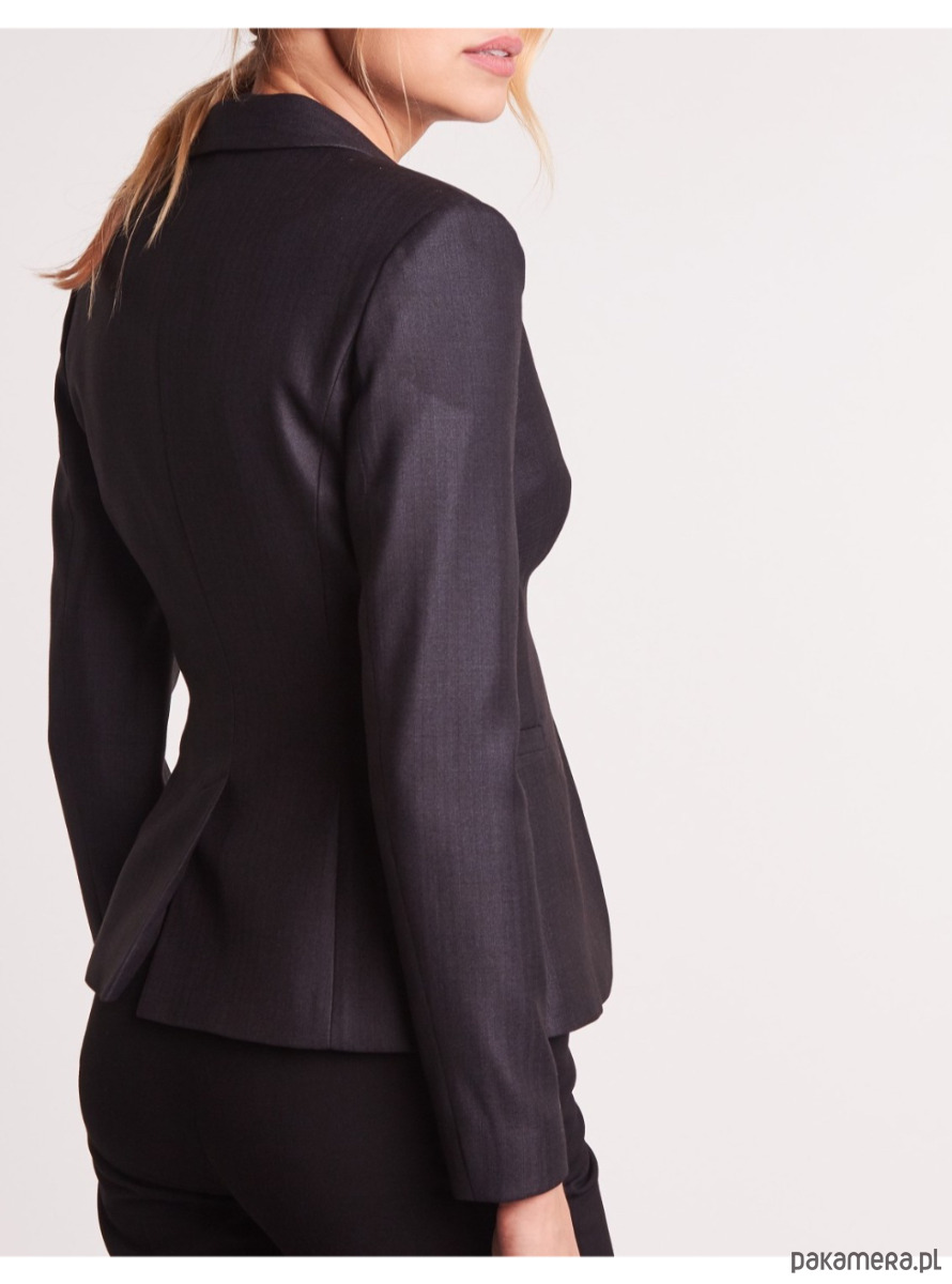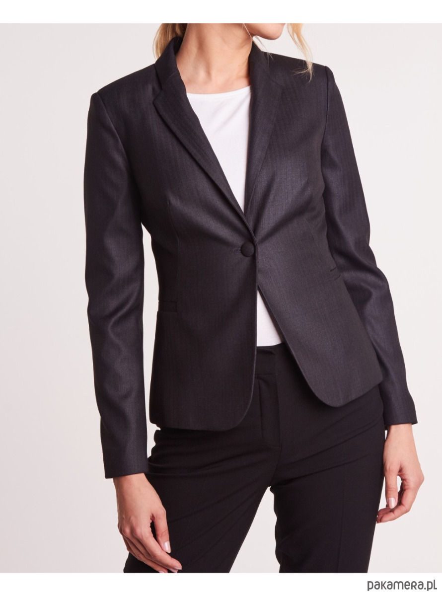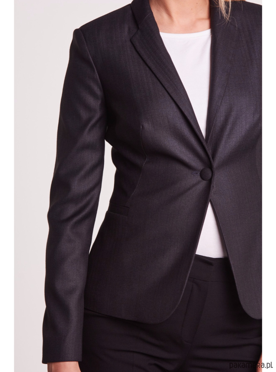 Marynarka o dopasowanym kroju (slim fit), wykonana z eleganckiej tkaniny w odcieniu grafitowym z subtelnym połyskiem. Zapinana na guzik w kolorze materiału. Idealna do oryginalnego podkreślenia każdej stylizacji. Krój wysmukłą sylwetkę. Doskonale sprawdzi się na formalne wyjścia, do pracy jak również do codziennych stylizacji.