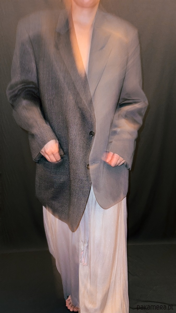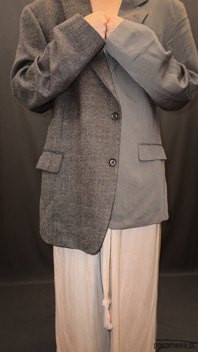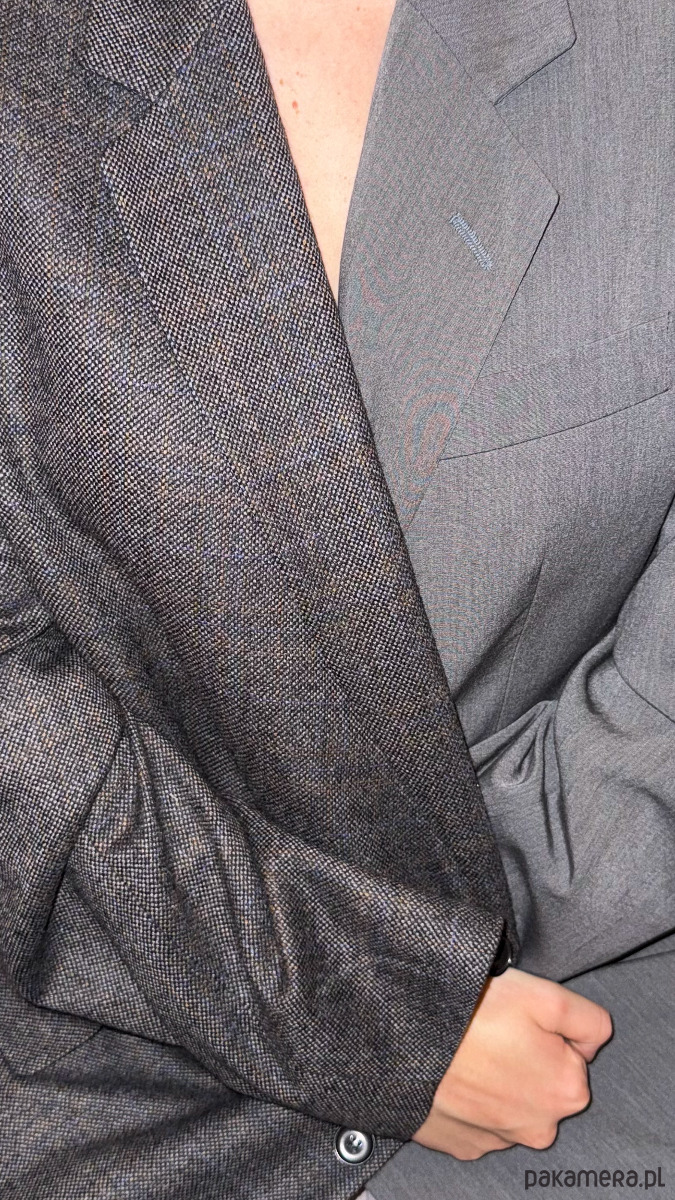 Marynarka Steel & Smoke to połączenie subtelnego blasku i strukturalnej głębi. Pierwsza strona to delikatna stalowa szarość z dyskretnym połyskiem, druga - grafitowa marynarka o wyraźnej, wełnianej fakturze. Obie pochodzą z drugiego obiegu, wybrane tak, by stworzyć harmonijny, a jednocześnie kontrastowy duet.