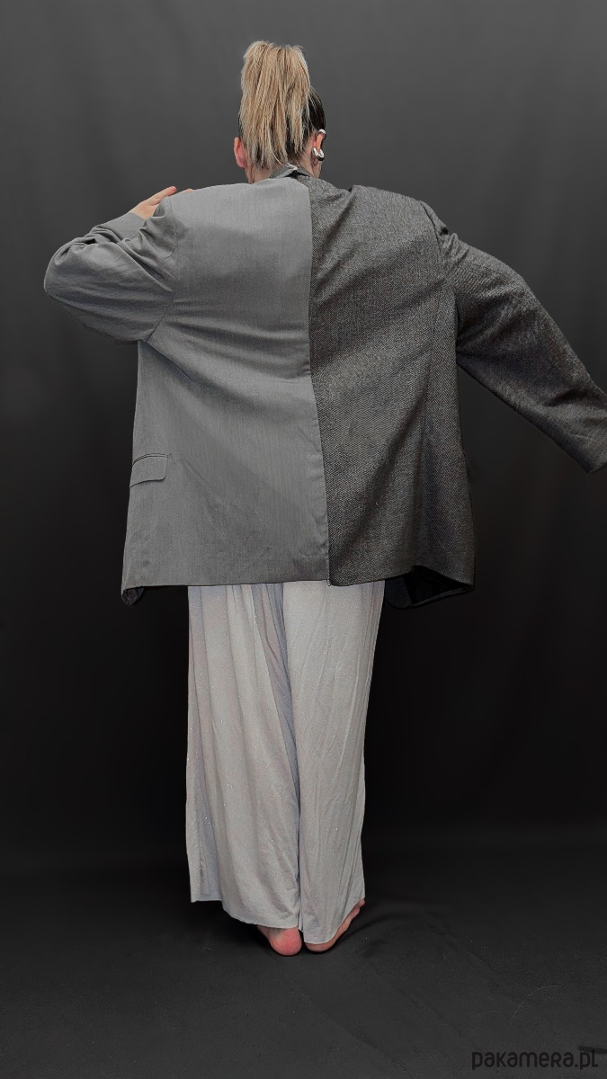 Zszyłam je w formę double, dzięki czemu powstała marynarka o wyraźnej, geometrycznej linii i wyważonym charakterze. Steel & Smoke jest jednocześnie elegancka i nonszalancka, idealna dla osób, które lubią minimalistyczne projekty, ale z wyczuwalną „iskrą”.