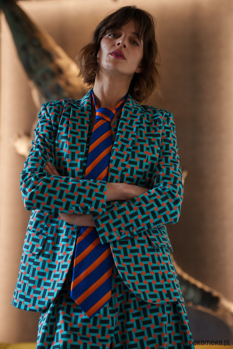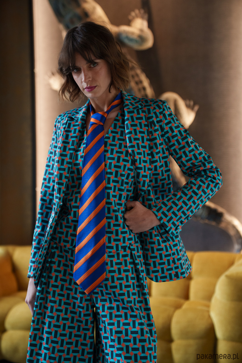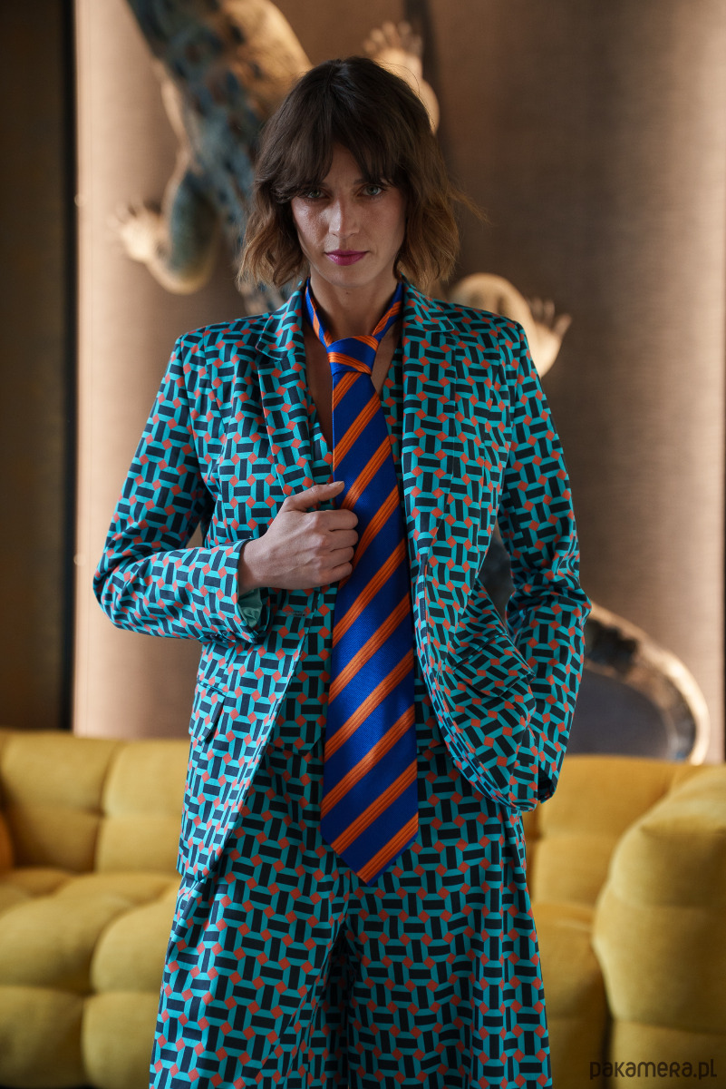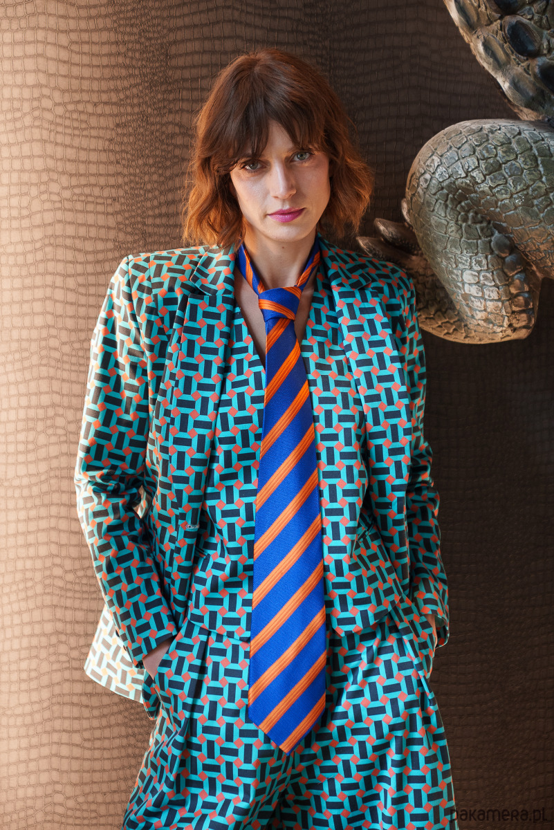 Dobrze skrojona marynarka to podstawa garderoby każdej kobiety. Najważniejszą rolę odgrywa tu fason oraz naturalny materiał. Nasze marynarki powstały ze 100% z bawełny, która posiada właściwości higroskopijne, dzięki czemu doskonale sprawdza się nawet podczas upałów. Marynarka ma piękny hipnotyzujący wzór. Warto przyjrzeć się także samej konstrukcji. Kolorowy żakiet został uszyty z ośmiu części, co sprawia, że idealnie dopasowuje się do sylwetki, podkreślając jej wszystkie walory. W naszej kolekcji znajdziesz oryginalne marynarki o nietuzinkowych wzorach. Z tej samej tkaniny uszyliśmy również spodnie i kamizelkę.