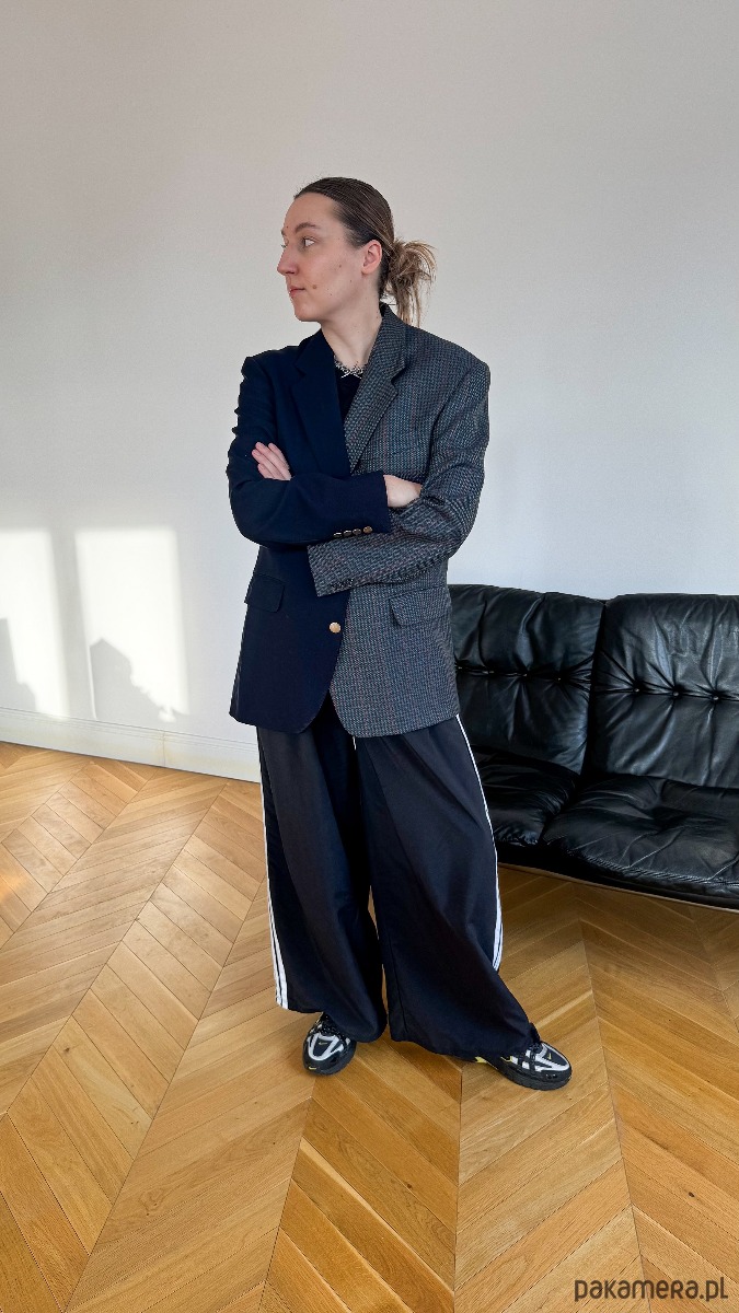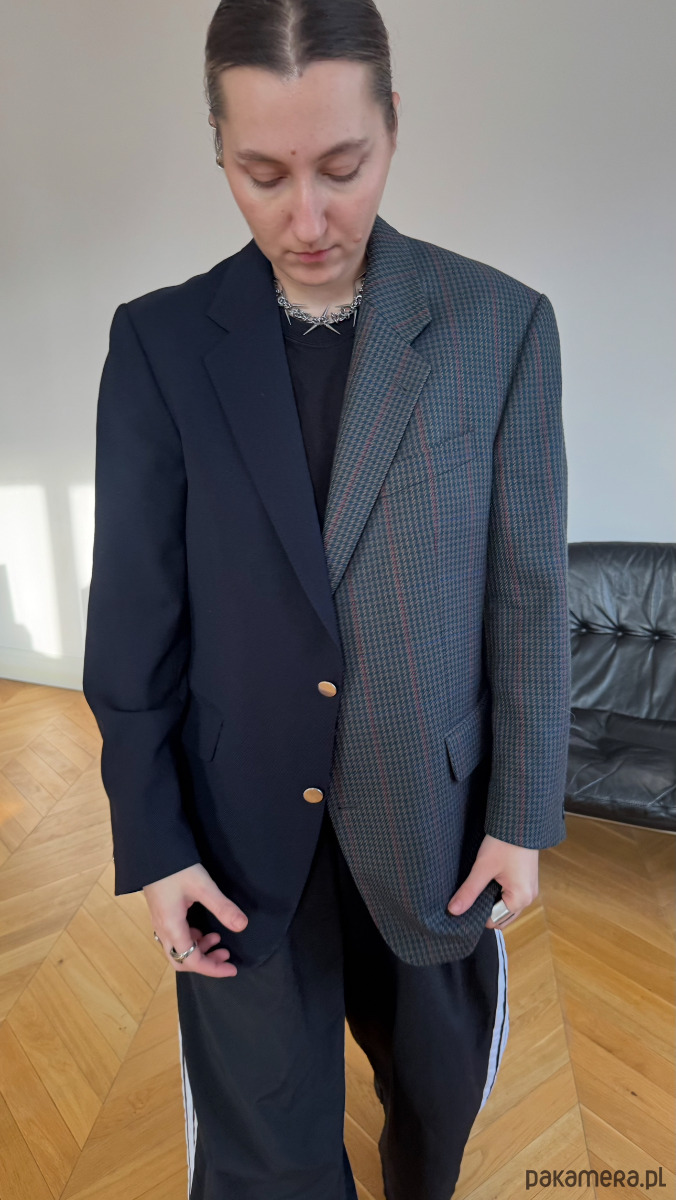 Połączyłam je w jeden projekt metodą double, tworząc charakterystyczną linię centralną, która podkreśla kontrast materiałów. Dzięki temu Twilight Checks balansuje pomiędzy elegancją a odważnym, współczesnym stylem. Jej oversizowy i unisex fason sprawia, że dopasowuje się do różnych sylwetek, a zestawienie dwóch stron daje efekt, który nie przejdzie niezauważony.
