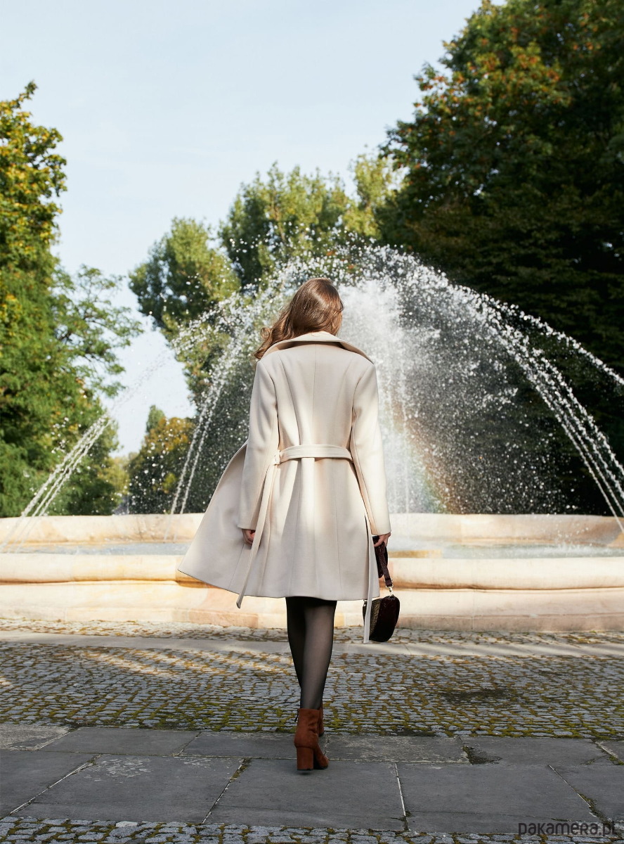 Płaszcz w beżowym kolorze, wykonany z miłej w dotyku tkaniny. Fason - szlafrokowy przewiązywany paskiem. Zaprojektowany i uszyty w rodzinnej szwalni w województwie świętokrzyskim.