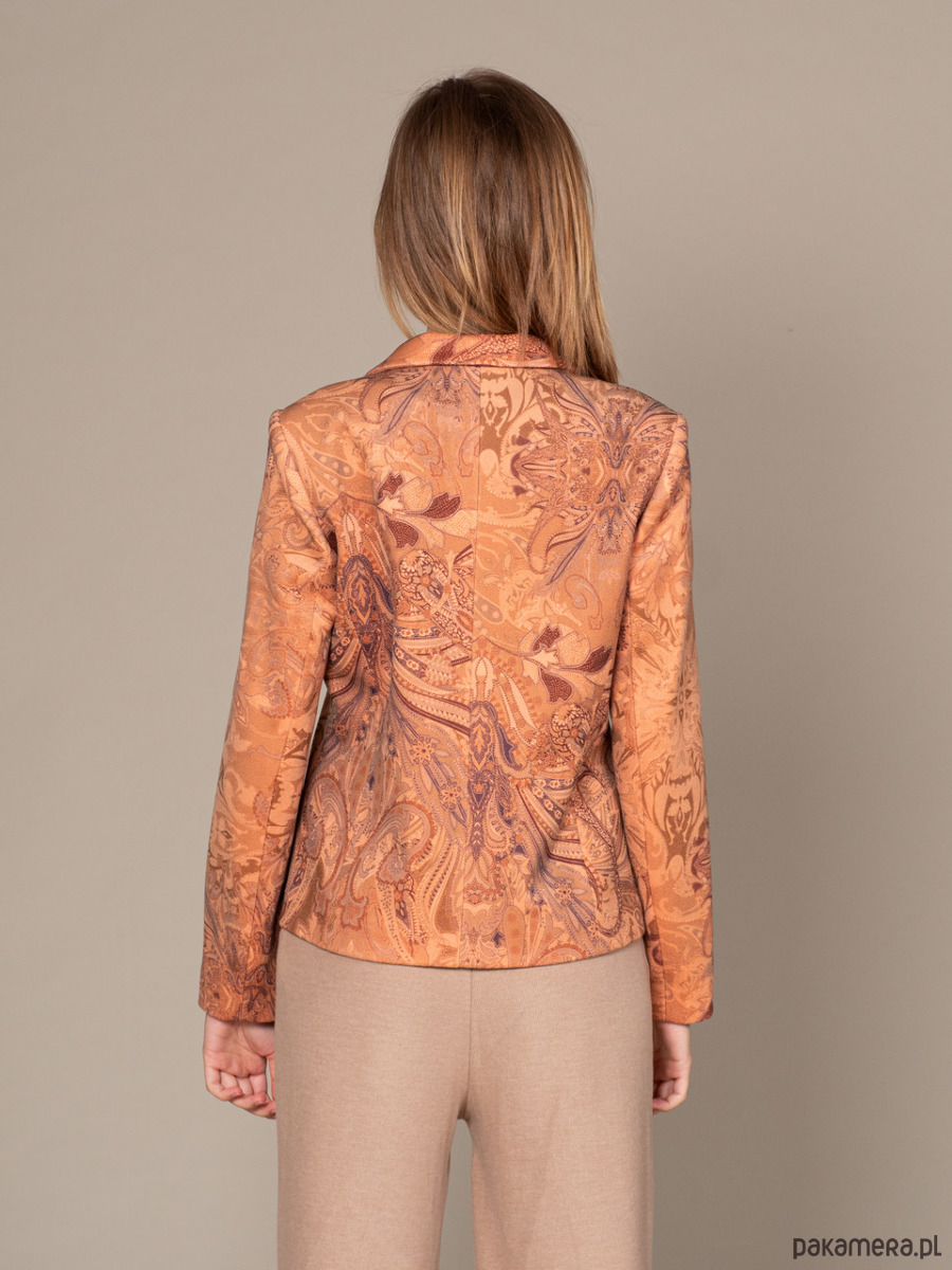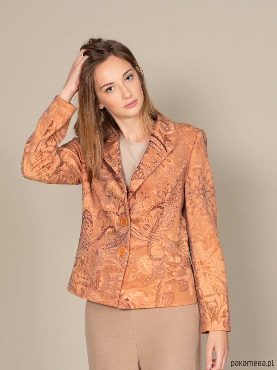 Jednorzędowy, kaszmirowy żakiet, który założysz na każdą okazję. Pasuje do camelowych spodni lub klasycznych dżinsów. Sportowa elegancja to jeden z trendów w modzie. Tkanina o ciekawym kwiatowym wzorze w odcieniach koloru łososiowego i delikatnego brązu