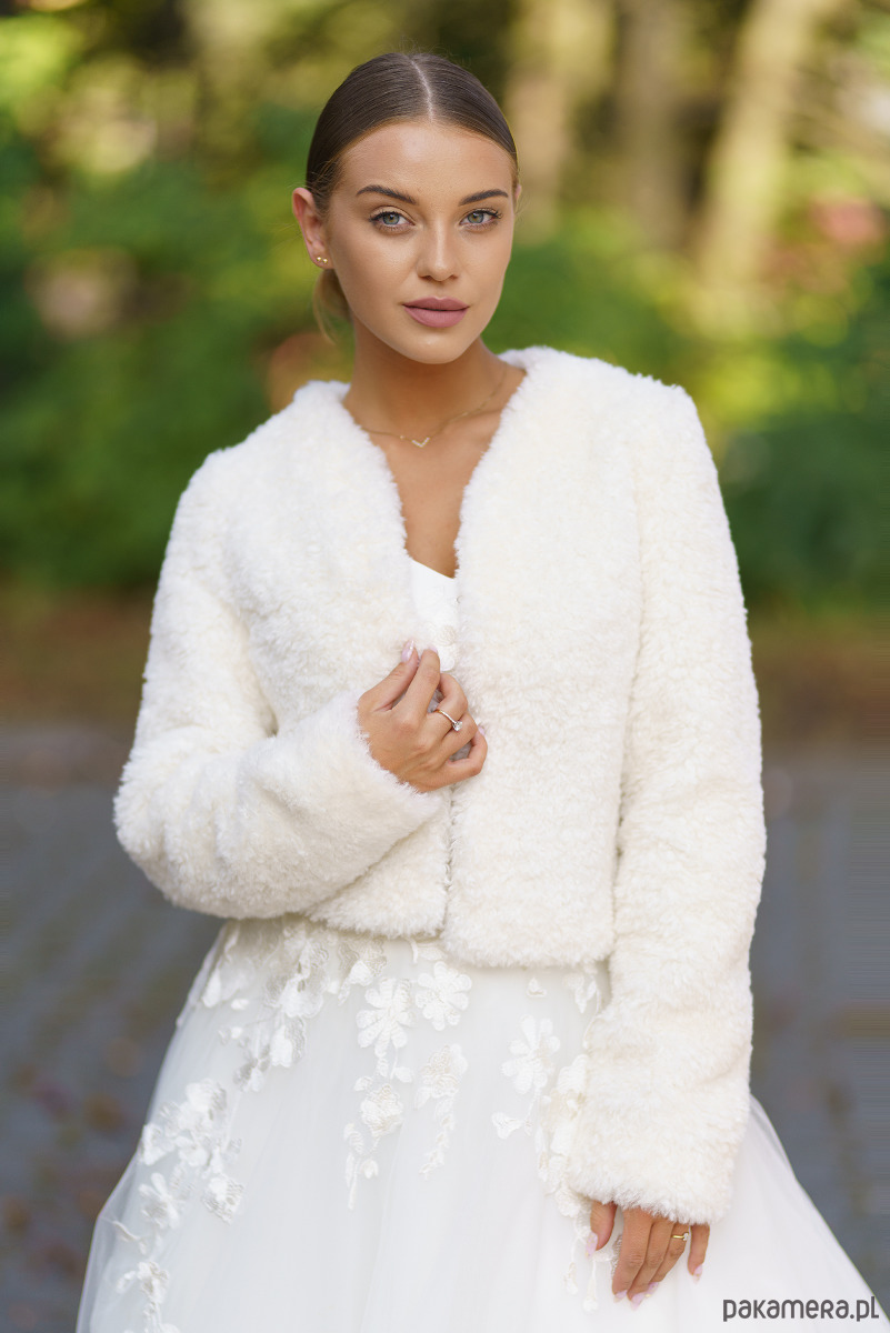 Ciepłe futerko ślubne w kolorze kremowym. Modelka prezentuje na zdjęciach rozmiar S.