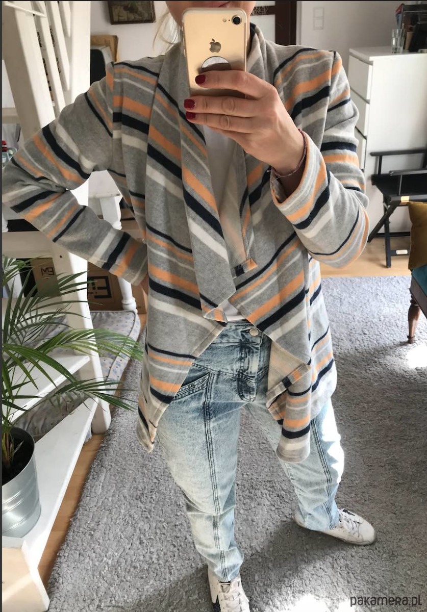 Narzutka o oryginalnym fasonie wykonana z niezwykle miękkiej w dotyku bawełny z domieszką elastanu. Super modne paski. Model z długimi rękawami oraz asymetrycznymi połami. Narzutka nie jest zapinana ale istnieje możliwość założenia przodów na siebie. Bardzo miękki materiał, niezwykle miły dla ciała. Tył prosty. To doskonała propozycja do modnych, casualowych stylizacji.