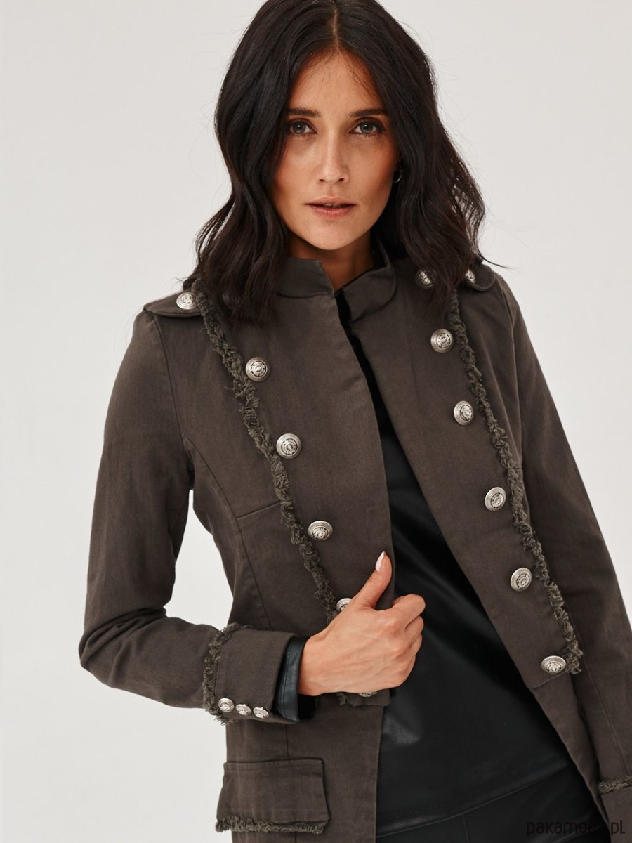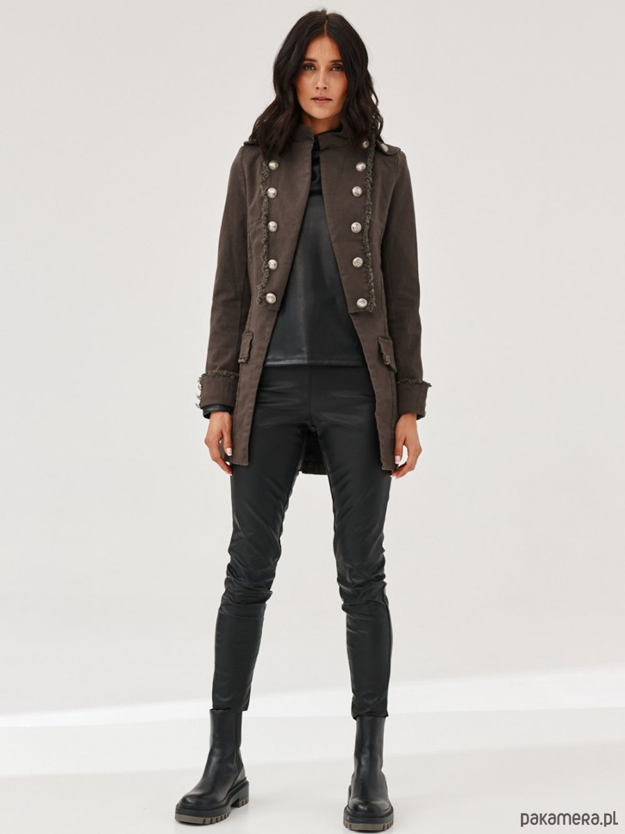 Żakiet ARENA z bawełnianej, mocno elastycznej tkaniny. Efekt lekkiego sprania. Ozdobne guziki na klapach przodu. Lekko postrzępione krawędzie. Kieszenie w boku.