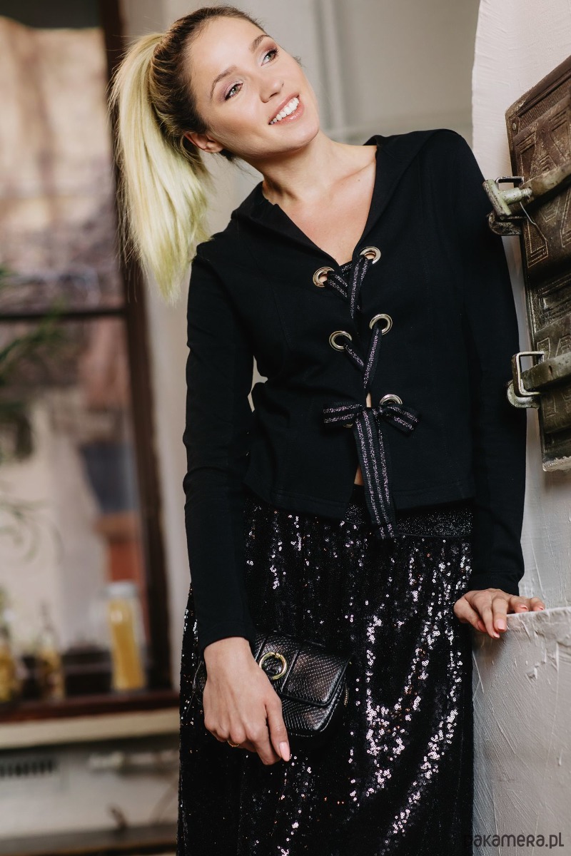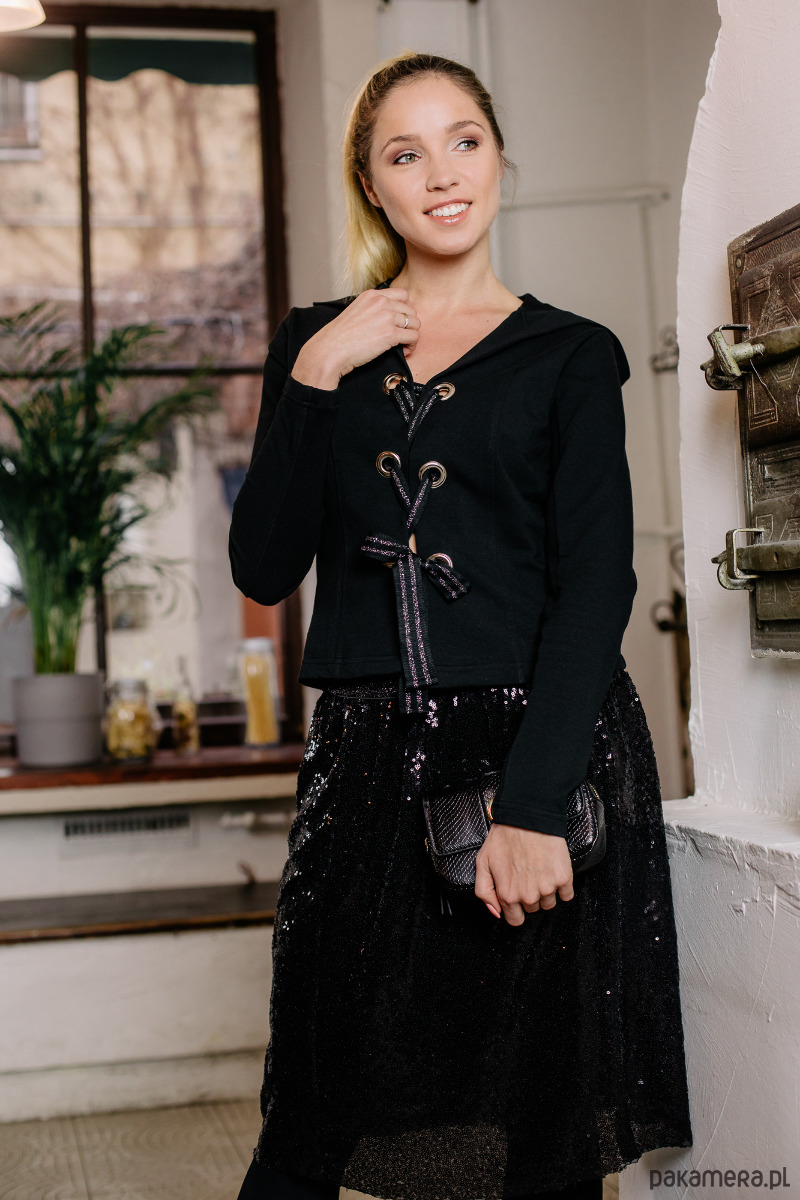 Krótki dzianinowy żakiet z kapturem i wiązaniem z przodu. Bardzo ciekawa interpretacja i przełamanie formy klasycznej marynarki.