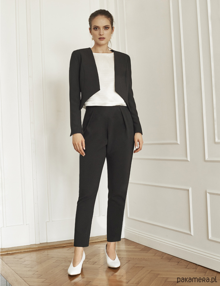 Inspirowany frakiem elegancki żakiet o geometrycznym kroju w kolorze śmietankowej bieli, z wyrazistymi, ostrymi cięciami nadającymi mu nowoczesnego charakteru. Założysz go do spodni, spódnicy czy sukienki. Prosta forma sprawia, że żakiet jest ponadczasowy i będzie dobrą inwestycją na lata. Żakiet można skompletować ze spodniami z tej samej tkaniny w kolorze śmietankowej bieli lub czerni, tworząc garnitur.