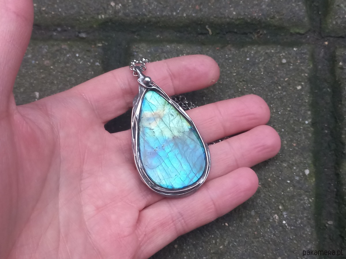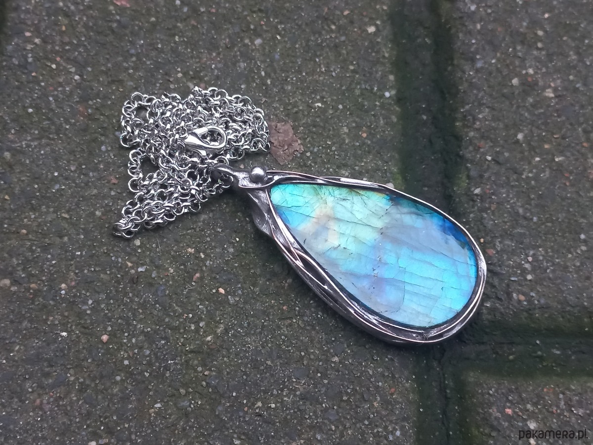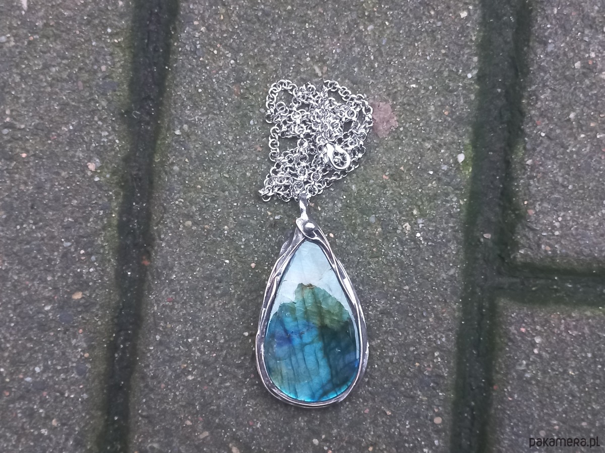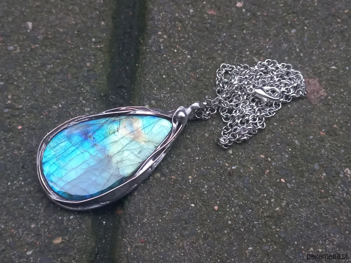 Wisiorek wykonany z miedzi, cyny i labradorytu. Wymiary ok. 5 na 3 cm. Zawieszony na łańcuszku o długości ok. 50 cm.