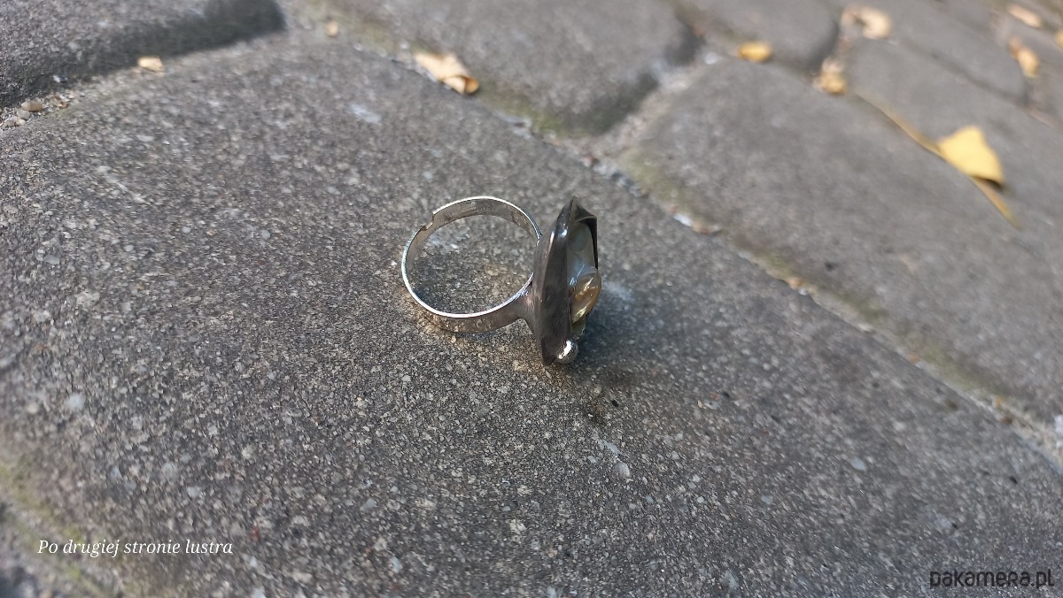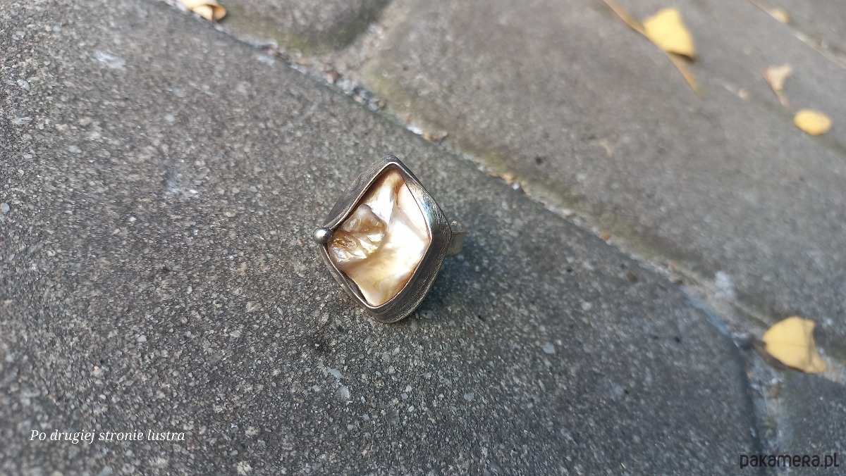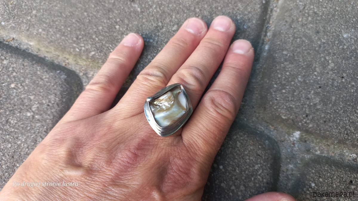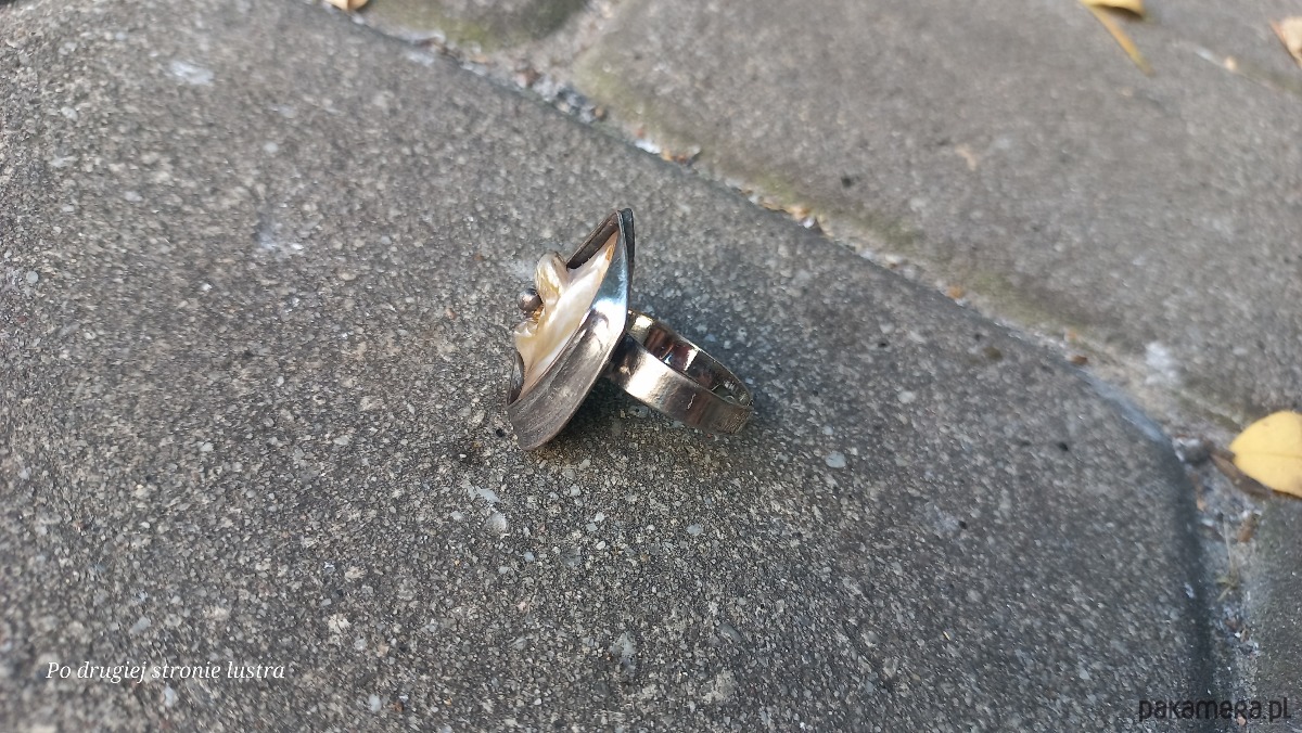 Pierścionek wykonany z miedzi, cyny i masy perłowej. Wymiary ok. 2,8 na 2.2 cm. Regulowany. Nie jest ciężki.