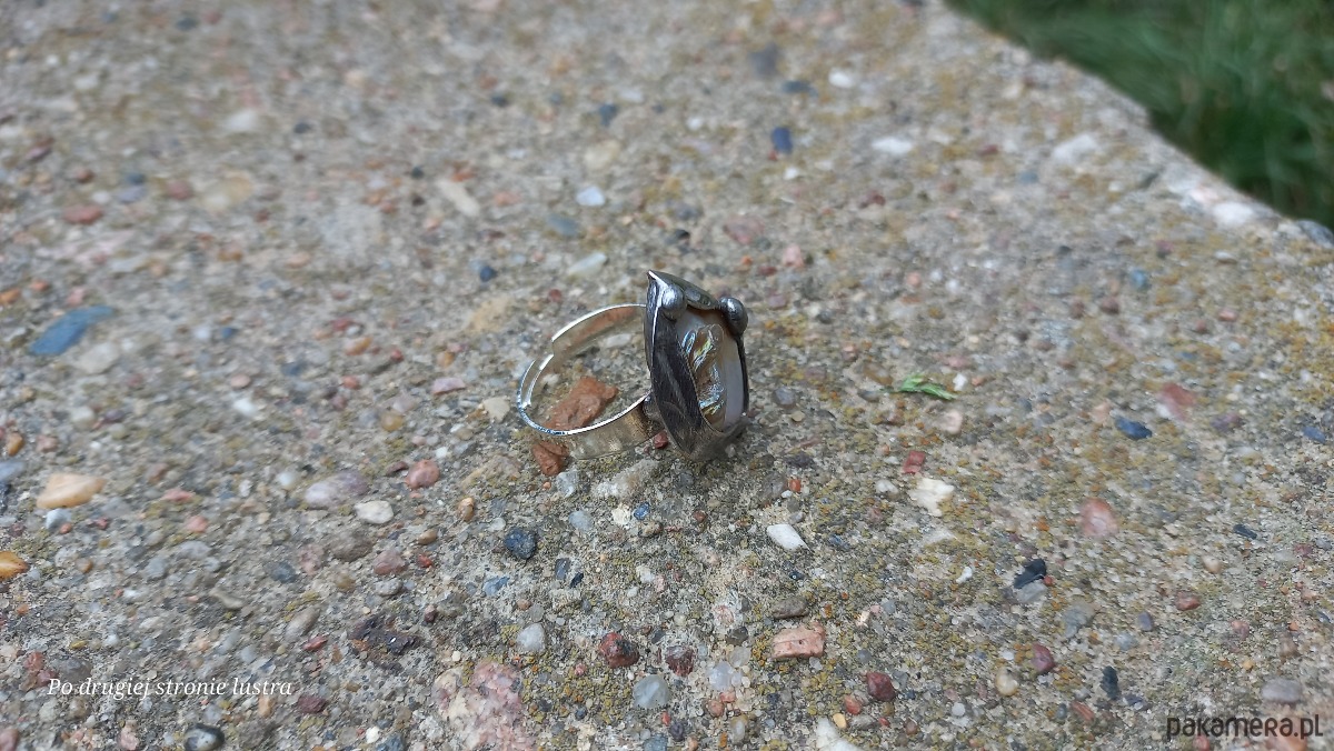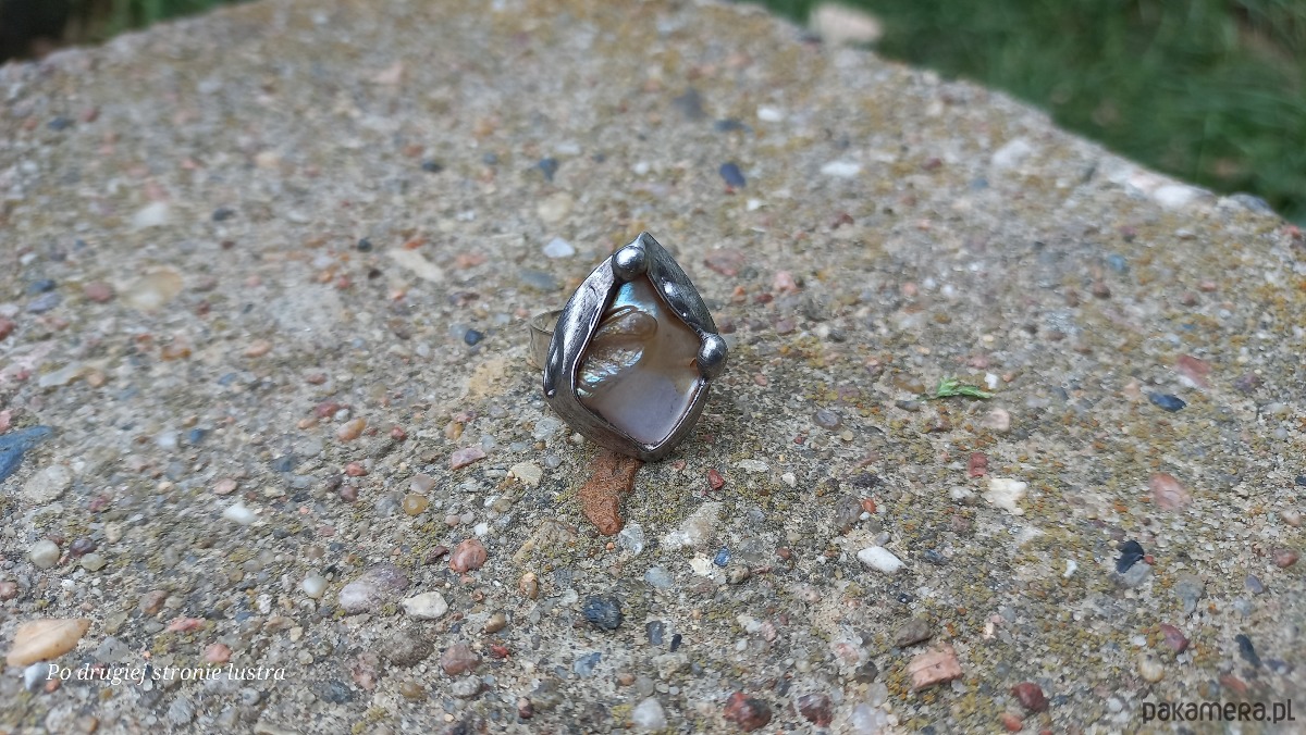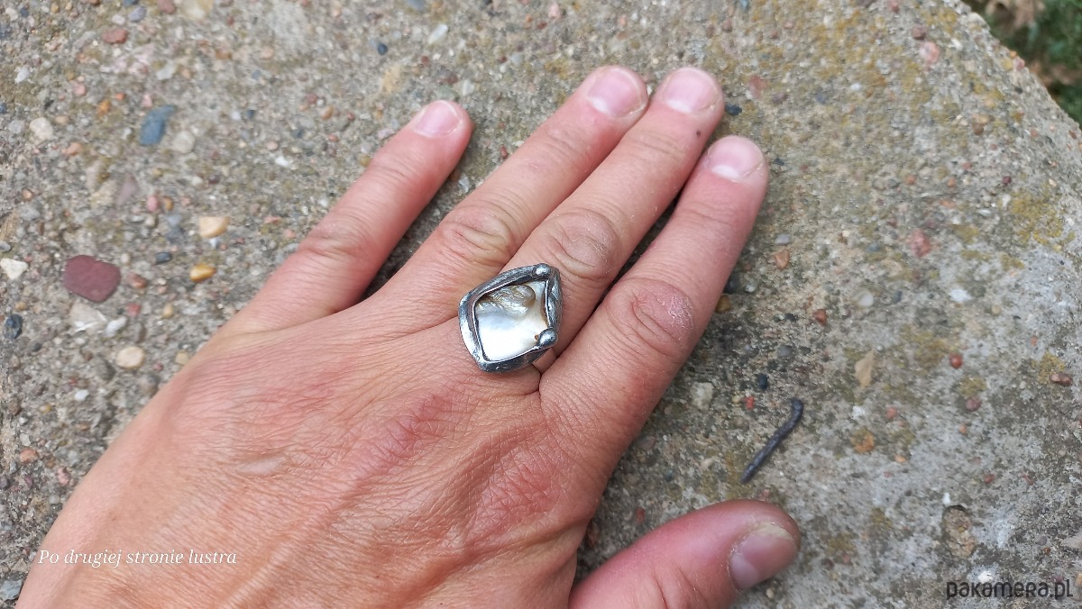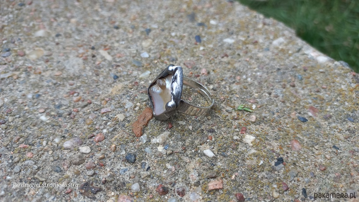 Pierścionek wykonany z miedzi, cyny i masy perłowej. Wymiary ok. 2,2 na 2 cm. Regulowany. Nie jest ciężki.