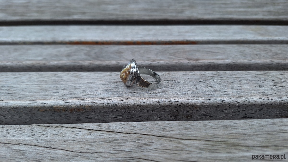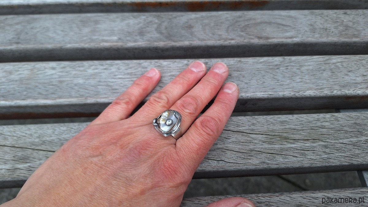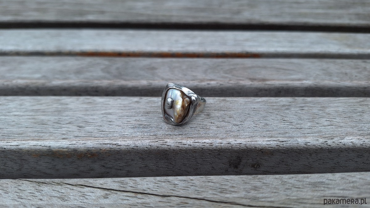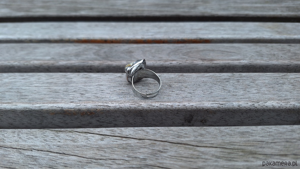 Pierścionek wykonany z miedzi, cyny i masy perłowej. Wymiary ok. 1.5 na 1.5 cm. Regulowany. Nie jest ciężki.