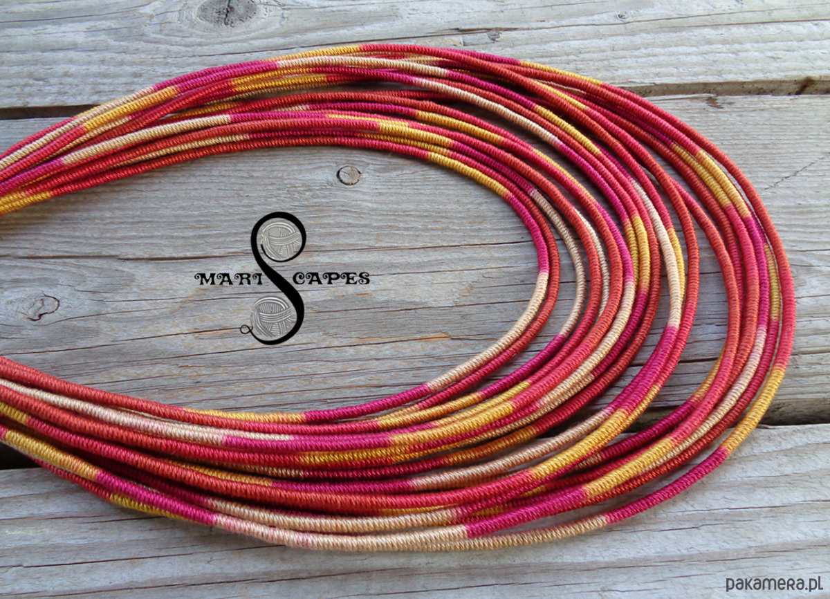 Unikalny naszyjnik w stylu etnicznym / afrykańskim z wymyślonej przeze mnie oryginalnej serii włóczkowych "Masajek". Długość ok. 45-65 cm Stworzony z połączenia wielu długich, nieco sztywnych sznureczków, pieczołowicie ręcznie owiniętych miękką włóczką (100% bawełna) . Wielowarstwowe kolorowe pasemka przywołują w pamięci masajskie ozdoby.