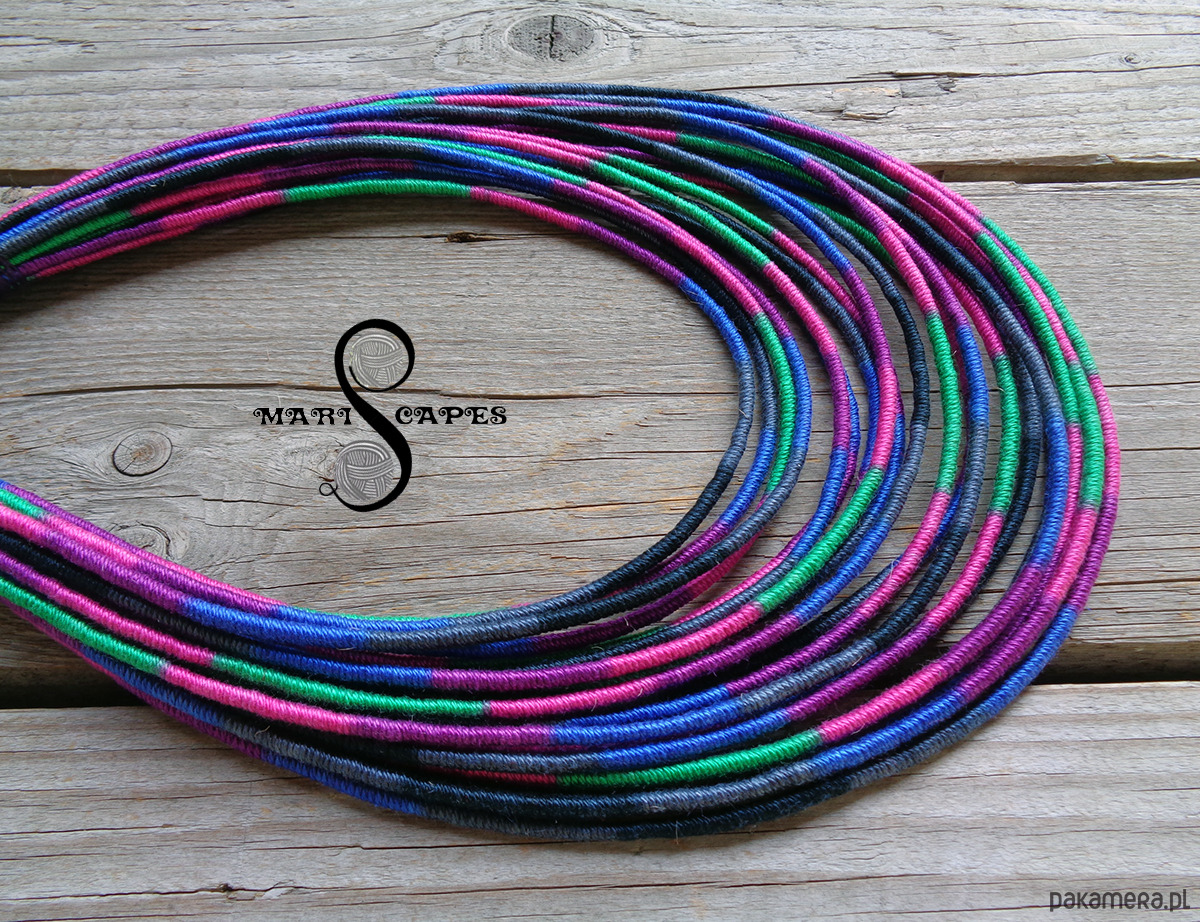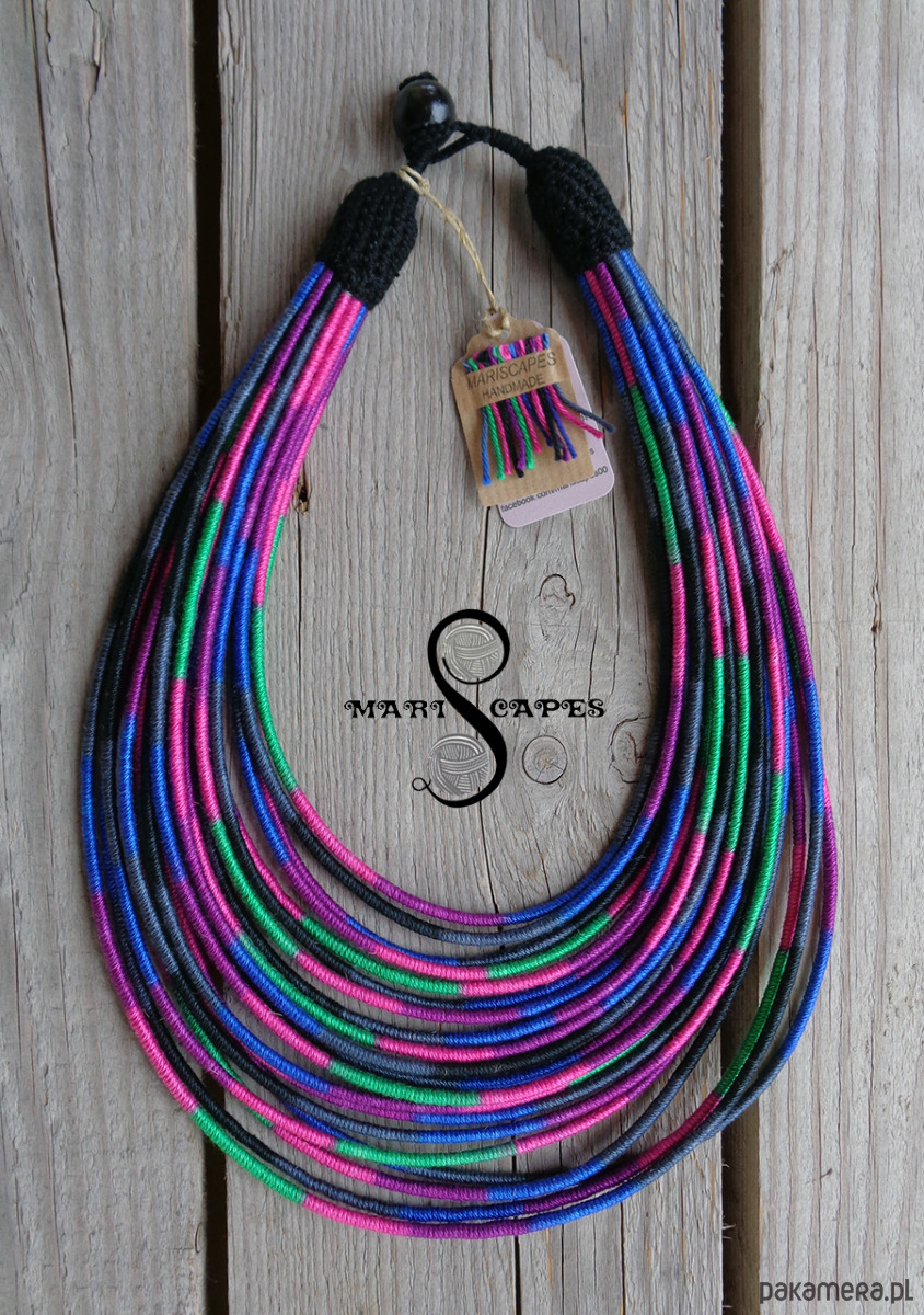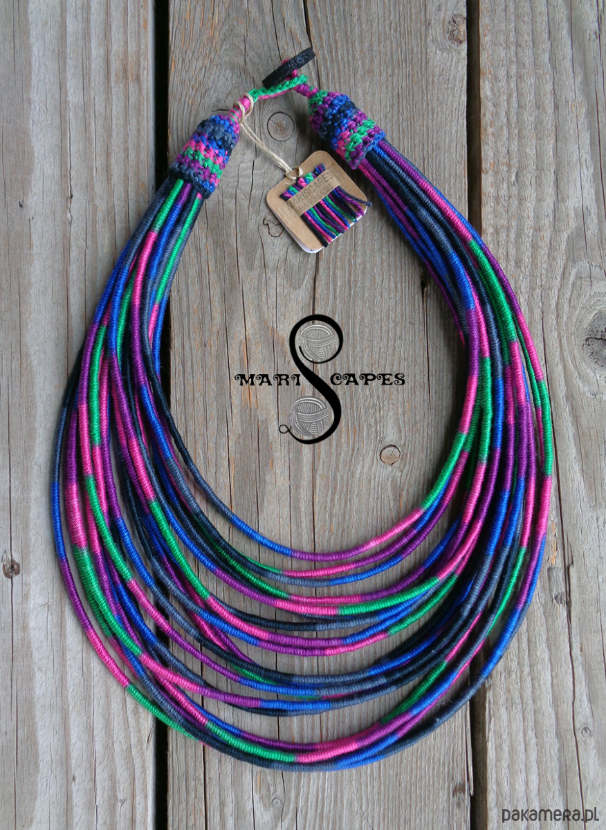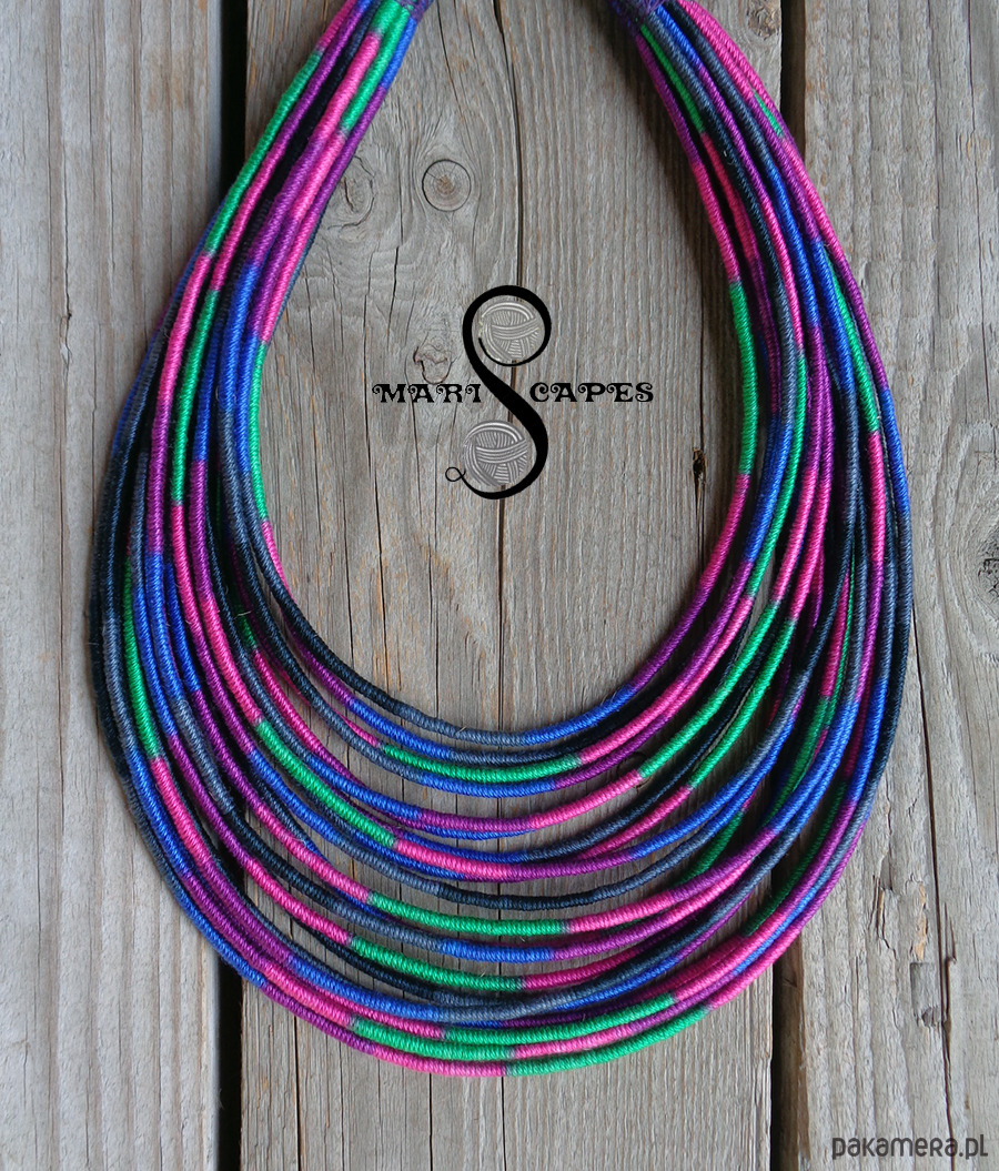 Unikalny naszyjnik w stylu etnicznym / afrykańskim z wymyślonej przeze mnie oryginalnej serii włóczkowych "Masajek". Długość ok. 45-65 cm Stworzony z połączenia wielu długich, nieco sztywnych sznureczków, pieczołowicie ręcznie owiniętych miękką włóczką (100% bawełna) . Wielowarstwowe kolorowe pasemka przywołują w pamięci masajskie ozdoby.