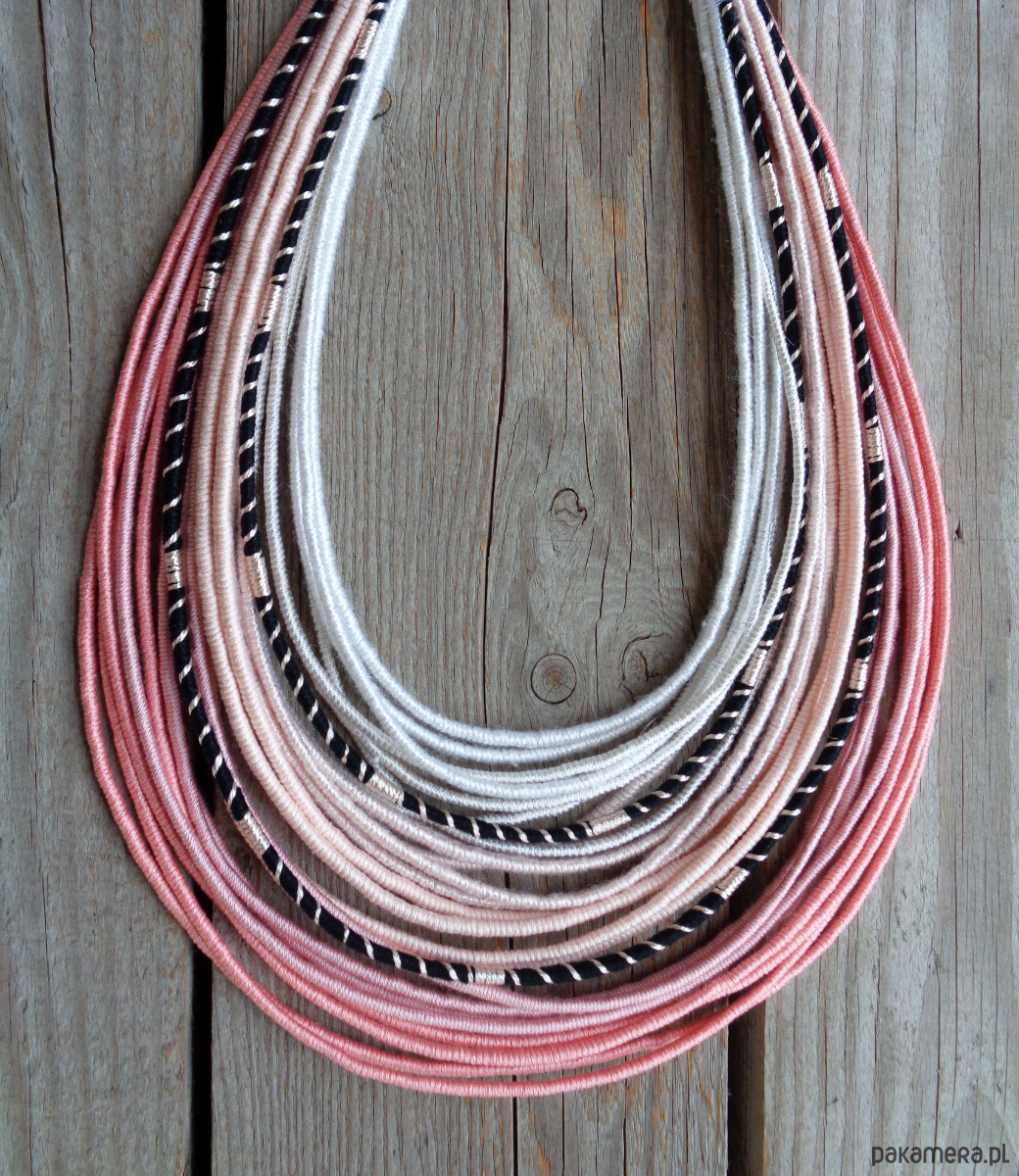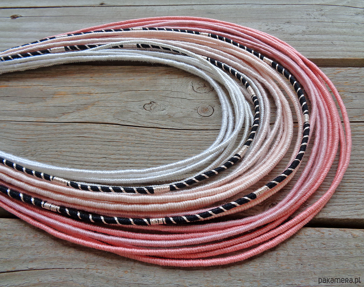 Unikalny naszyjnik w stylu etnicznym / afrykańskim z wymyślonej przeze mnie oryginalnej serii włóczkowych "Masajek". Stworzony z połączenia wielu długich, nieco sztywnych sznurków, pieczołowicie ręcznie owiniętych jedwabiście gładkimi i chłodnymi w dotyku włóczkami (mikrofibra z efektem jedwabiu, bawełna, wiskoza, jedwab) w odcieniach bielu, ecru, pastelowego koralowego różu z odrobiną kontrastującej czerni. Dzięki tej włóczce masajka jest szczególnie polecana na wiosnę/lato. Wielowarstwowe kolorowe pasemka przywołują w pamięci masajskie ozdoby.