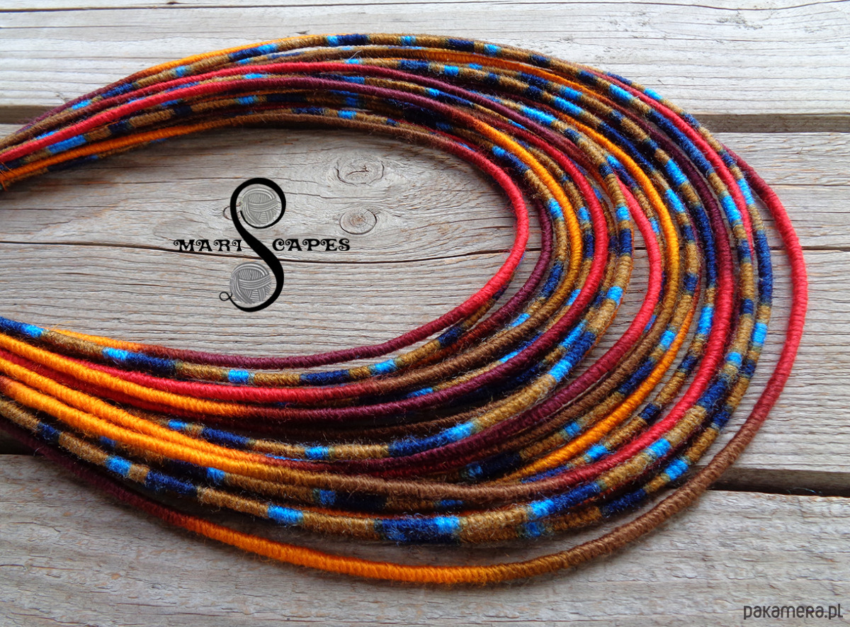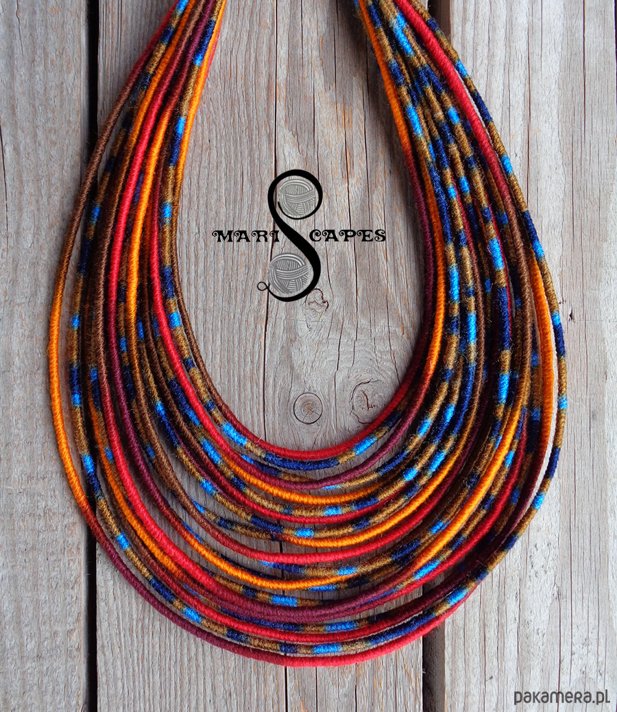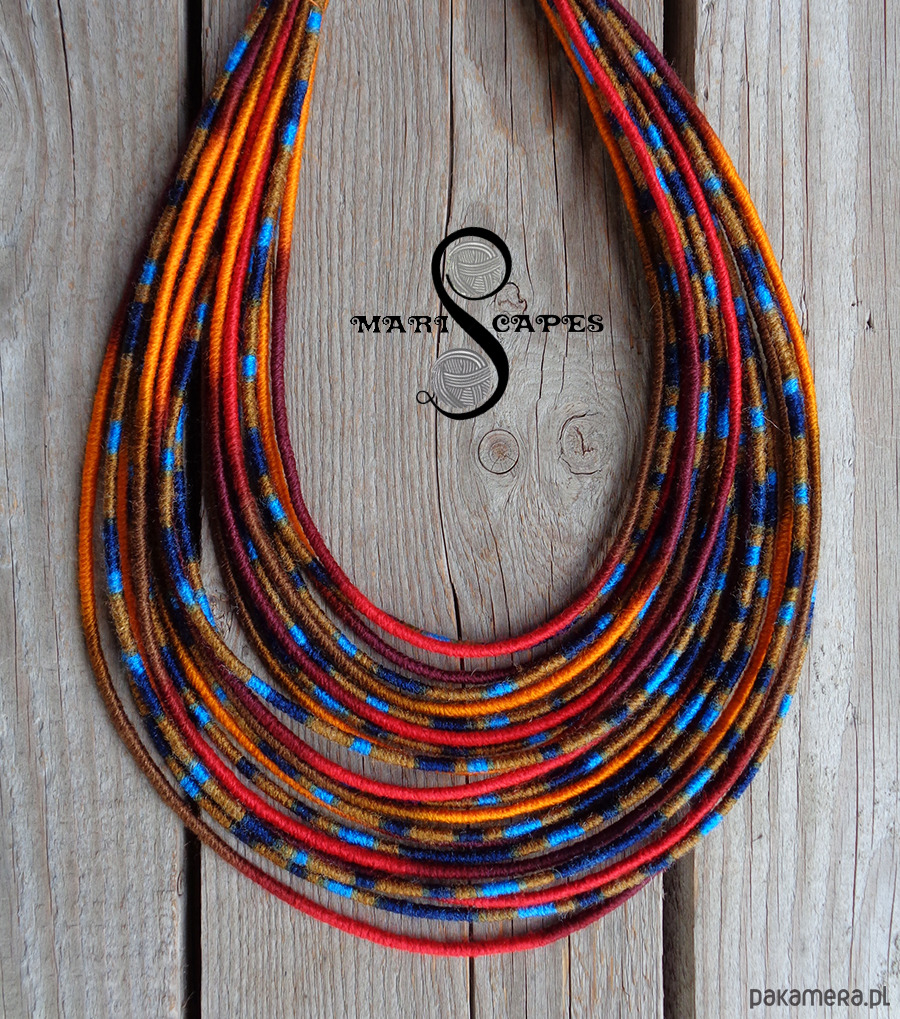 Unikalny naszyjnik w stylu etnicznym / afrykańskim z wymyślonej przeze mnie oryginalnej serii włóczkowych "Masajek". Długość ok. 45-65 cm Stworzony z połączenia wielu długich, nieco sztywnych sznurków, pieczołowicie ręcznie owiniętych miękką włóczką akrylową w soczystych odcieniach jesieni. Wielowarstwowe kolorowe pasemka przywołują w pamięci masajskie ozdoby.