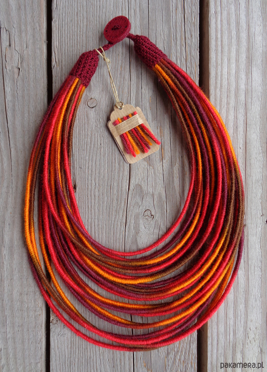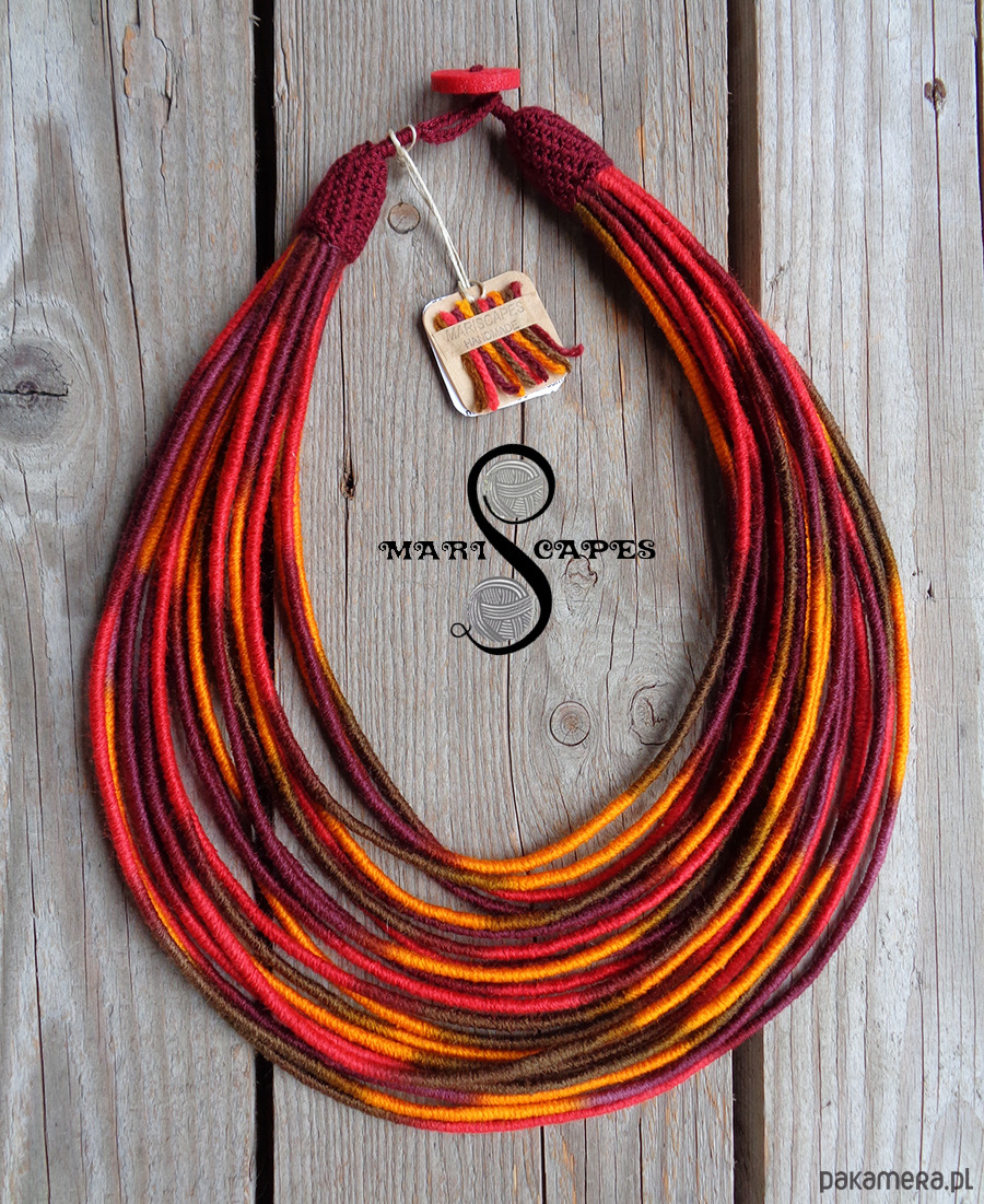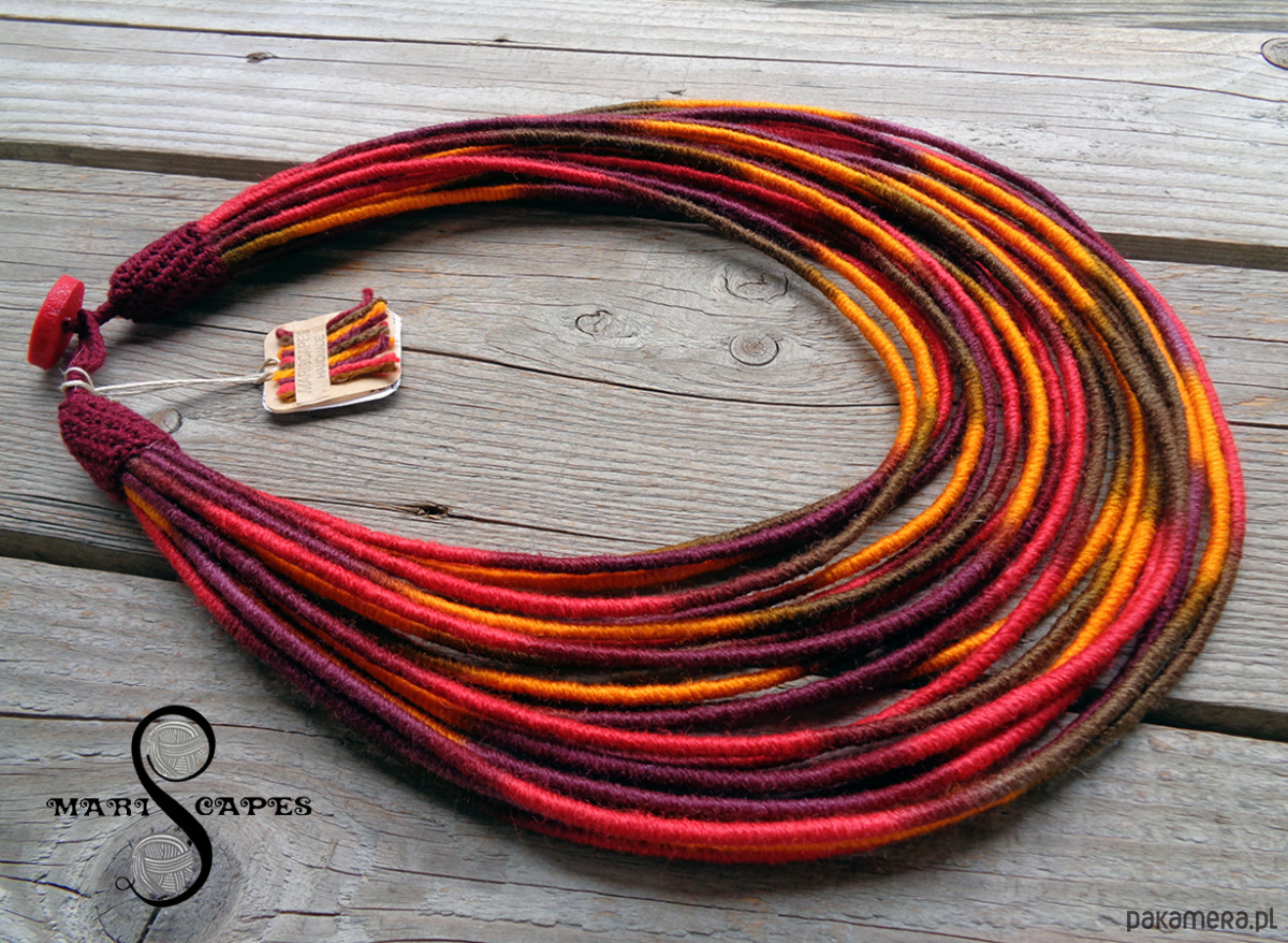 Unikalny naszyjnik w stylu etnicznym / afrykańskim z wymyślonej przeze mnie oryginalnej serii włóczkowych "Masajek". Długość ok. 45-65 cm Stworzony z połączenia wielu długich, nieco sztywnych sznurków, pieczołowicie ręcznie owiniętych miękką włóczką akrylową w soczystych odcieniach jesieni. Wielowarstwowe kolorowe pasemka przywołują w pamięci masajskie ozdoby.