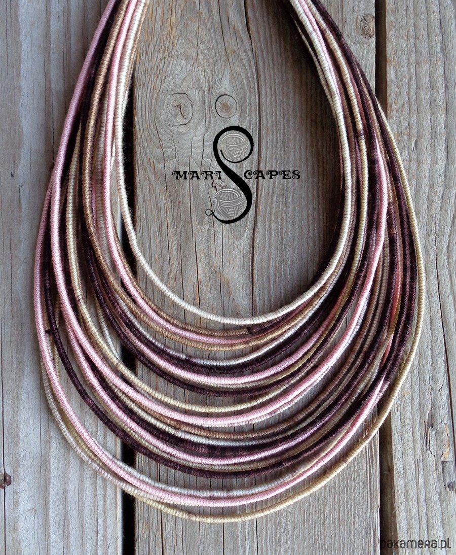 Unikalny naszyjnik w stylu etnicznym / afrykańskim z wymyślonej przeze mnie oryginalnej serii włóczkowych "Masajek". Długość ok. 45-65 cm Stworzony z połączenia wielu długich, nieco sztywnych sznurków, pieczołowicie ręcznie owiniętych miękką włóczką akrylową i bawełnianą w spokojnych odcieniach beżu i brązu, z odrobiną zgaszonego różu. Wielowarstwowe kolorowe pasemka przywołują w pamięci masajskie ozdoby.