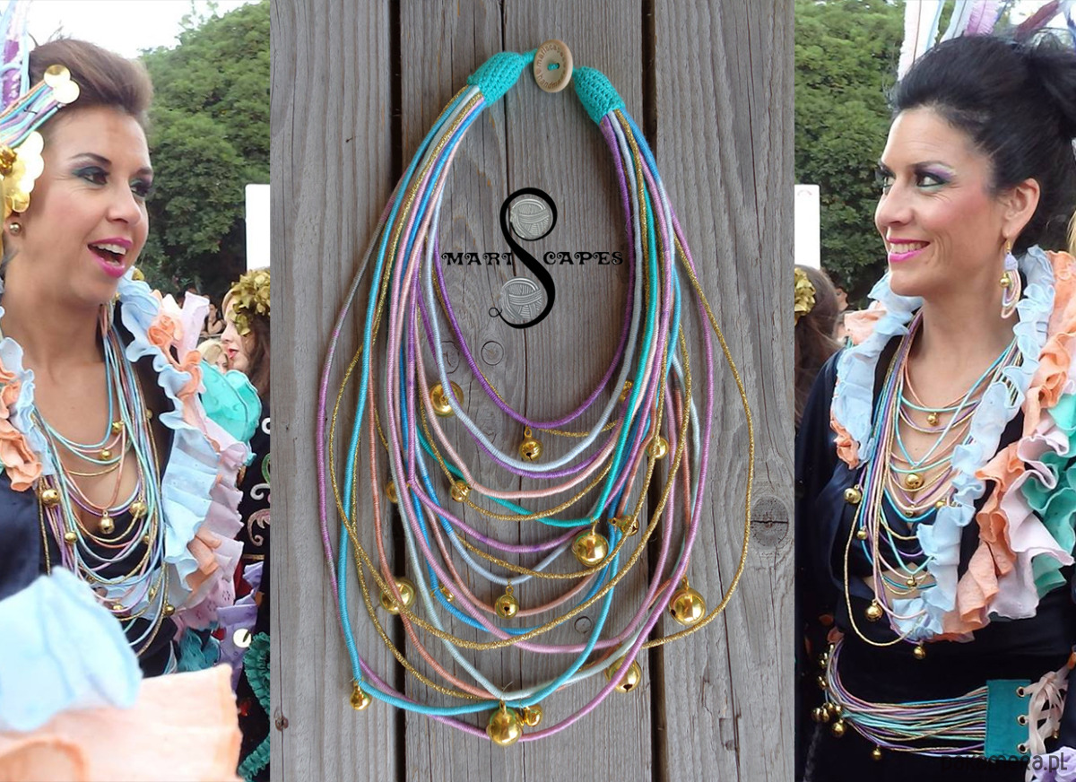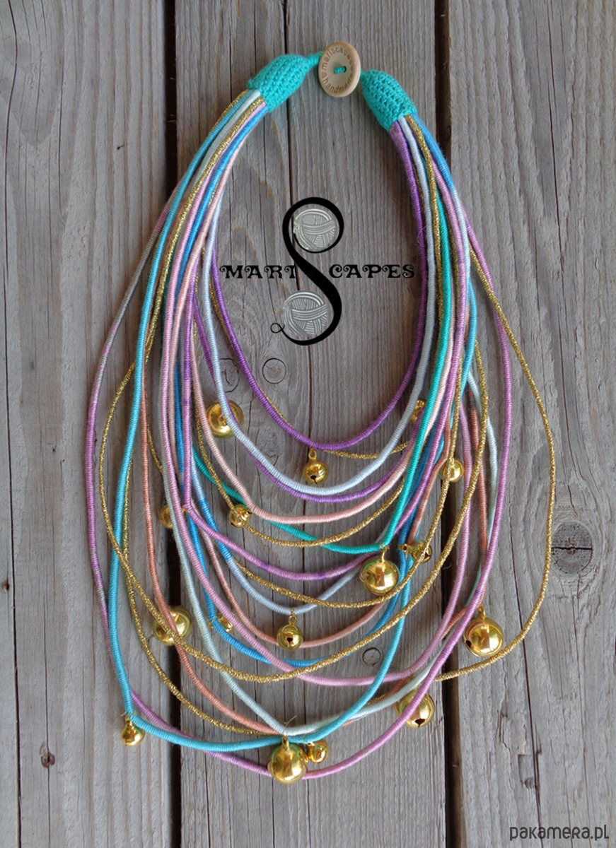 Unikalny naszyjnik w stylu etnicznym / afrykańskim z wymyślonej przeze mnie oryginalnej serii włóczkowych "Masajek". Długość ok. 45-65 cm Stworzony z połączenia wielu długich, nieco sztywnych sznurków, pieczołowicie ręcznie owiniętych jedwabiście gładką włóczką (100% mikrofibra z efektem jedwabiu) w pastelowych odcieniach i złotą błyszczącą nitką. Dodatkowo ozdobiony DZWONECZKAMI różnej wielkości. Wielowarstwowe kolorowe pasemka przywołują w pamięci masajskie ozdoby.