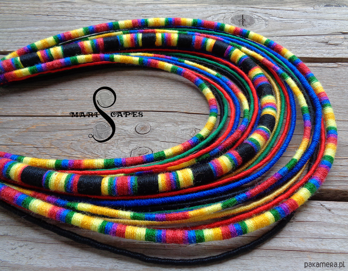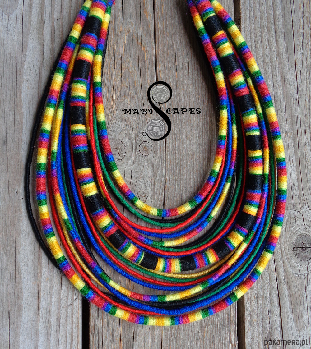 Unikalny naszyjnik w stylu etnicznym / afrykańskim z wymyślonej przeze mnie autorskiej serii włóczkowych "Masajek". Długość ok. 45-70 cm Stworzony z połączenia wielu długich, nieco sztywnych sznurków, pieczołowicie ręcznie owiniętych miękką włóczką w intensywnych odcieniach przypominających Łowickie motywy. AUTORSKI PROJEKT I WZÓR, który stał się bestsellerem! Wielowarstwowe kolorowe pasemka przywołują w pamięci masajskie ozdoby.