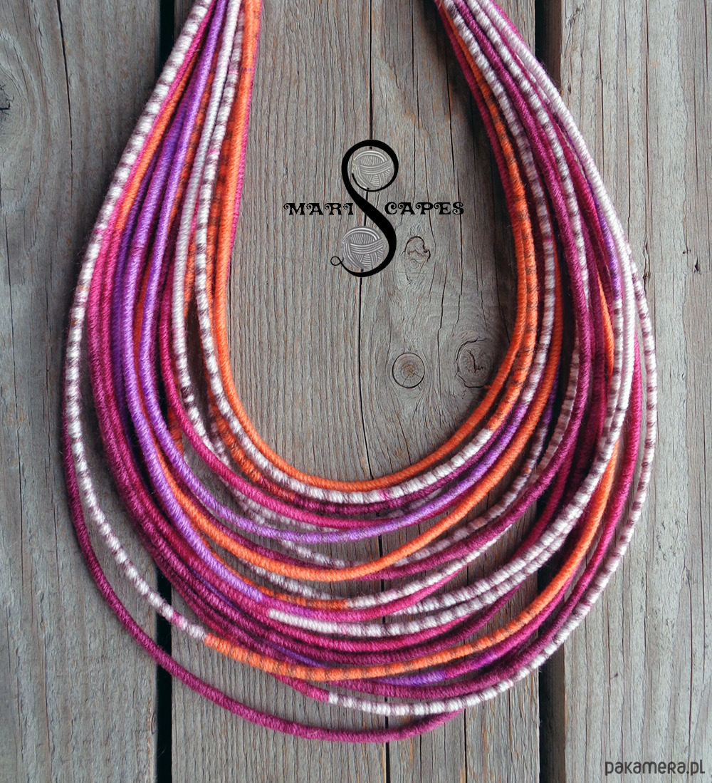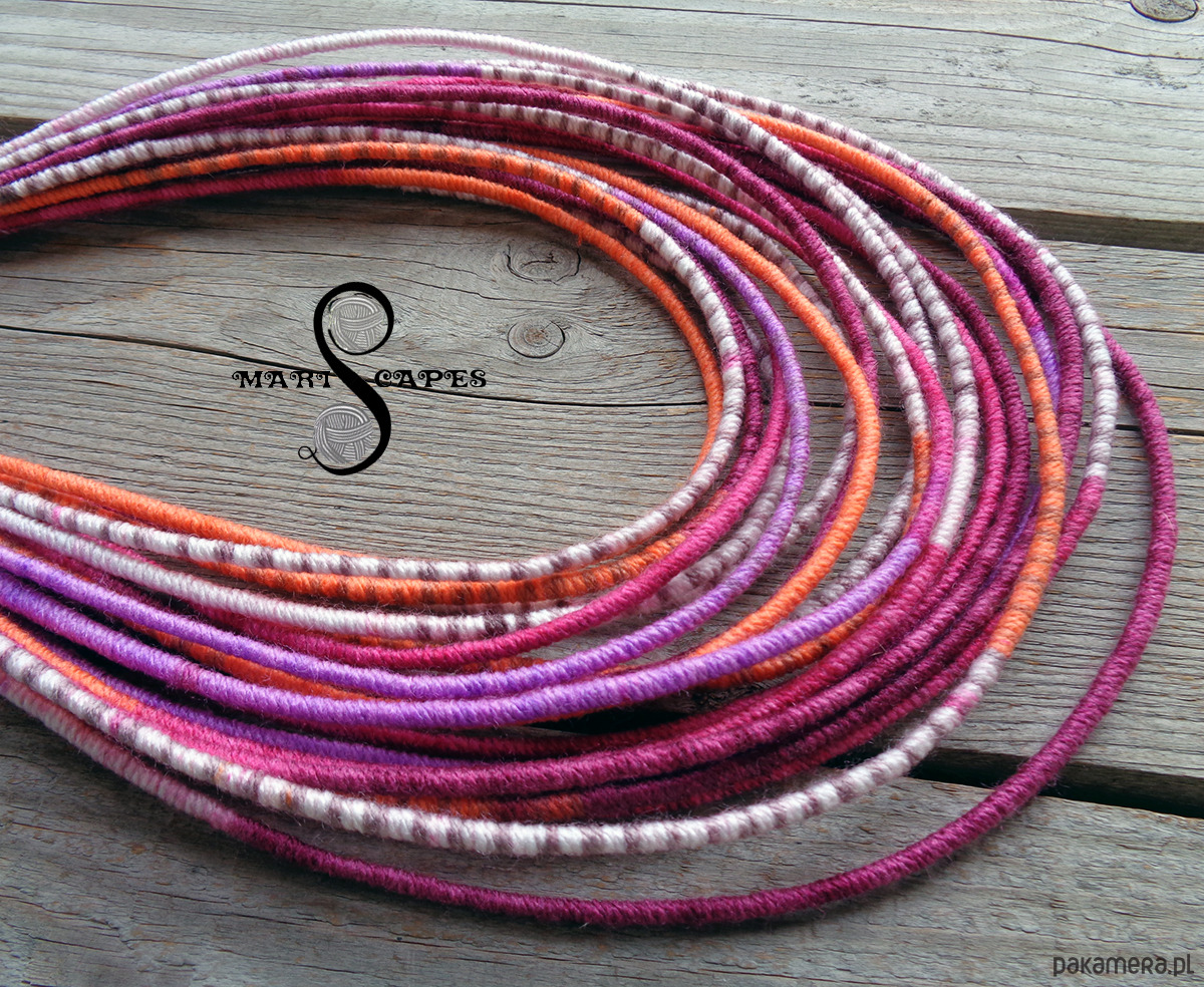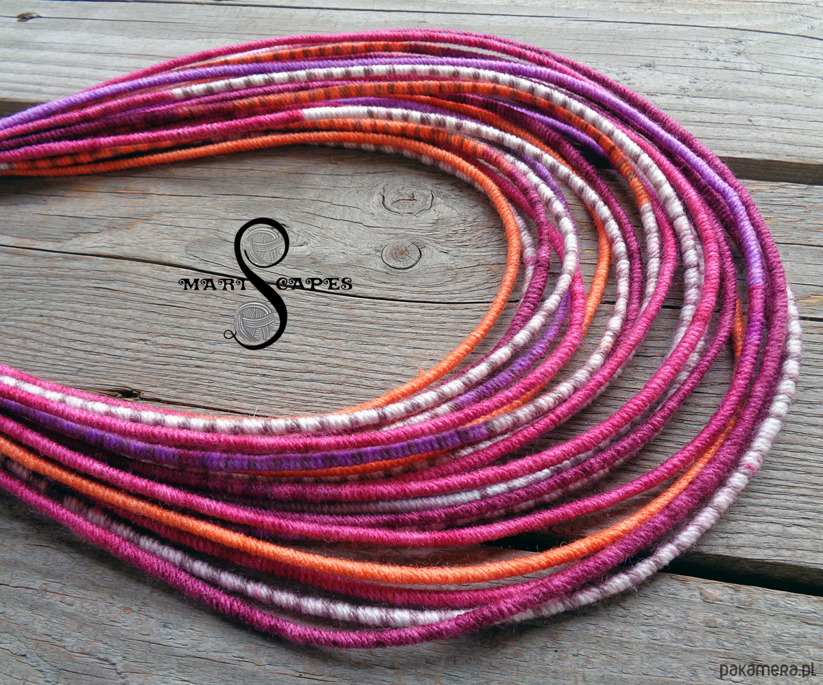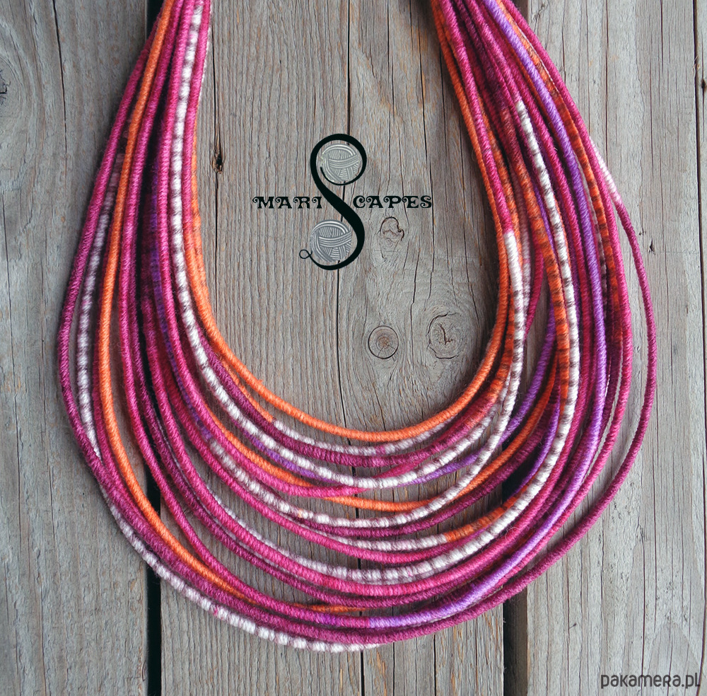 Unikalny naszyjnik w stylu etnicznym / afrykańskim z wymyślonej przeze mnie oryginalnej serii włóczkowych "Masajek". Długość ok. 45-65 cm Stworzony z połączenia wielu długich, nieco sztywnych sznurków, pieczołowicie ręcznie owiniętych miękką włóczką akrylową w pięknych "walentynkowych" odcieniach. Wielowarstwowe kolorowe pasemka przywołują w pamięci masajskie ozdoby.
