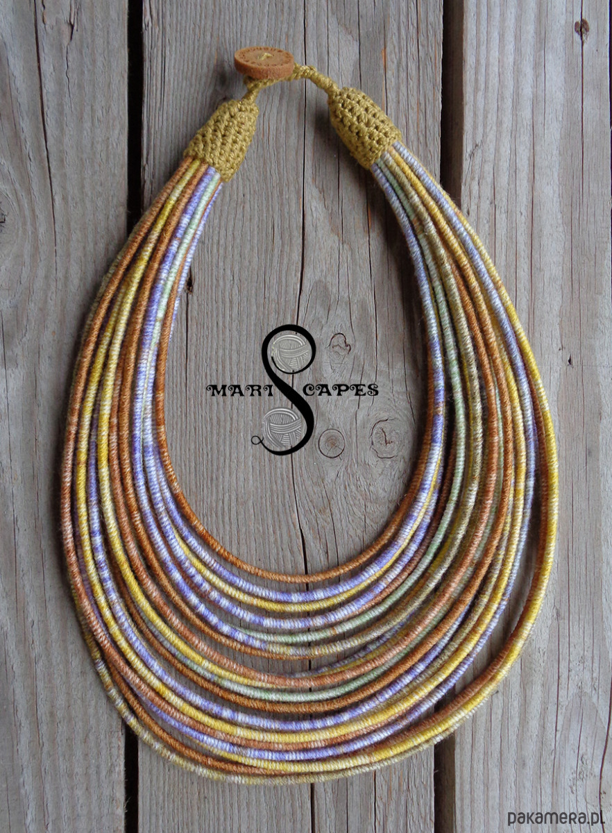Unikalny naszyjnik w stylu etnicznym / afrykańskim z wymyślonej przeze mnie oryginalnej serii włóczkowych "Masajek". Długość ok. 45-65 cm. Stworzony z połączenia wielu długich, nieco sztywnych sznurków, pieczołowicie ręcznie owiniętych miękką włóczką 100% akrylową. Wielowarstwowe kolorowe pasemka przywołują w pamięci masajskie ozdoby.