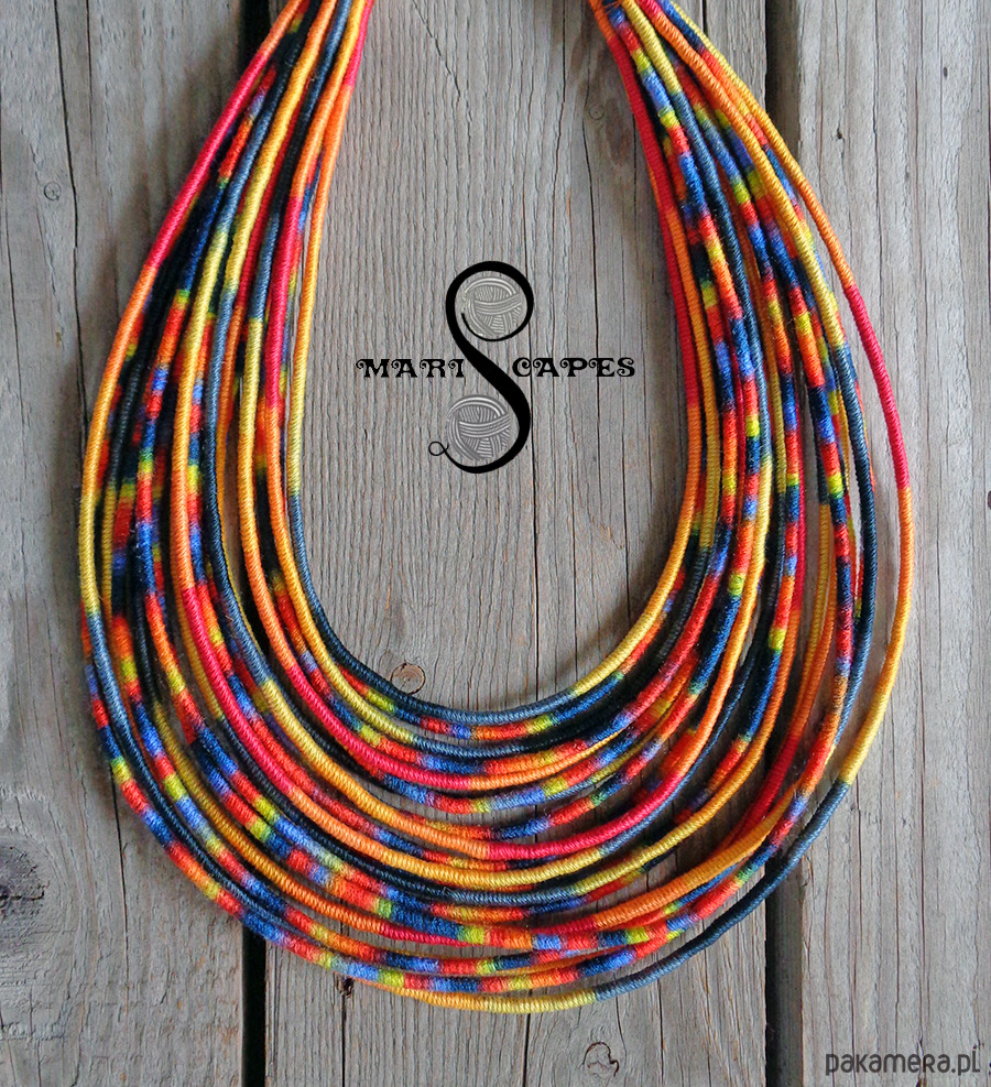 Unikalny naszyjnik w stylu etnicznym / afrykańskim z wymyślonej przeze mnie oryginalnej serii włóczkowych "Masajek". Długość ok. 45-65 cm Stworzony z połączenia wielu długich, nieco sztywnych sznureczków, pieczołowicie ręcznie owiniętych miękką włóczką (100% bawełna + 100% akryl) w ognistych kolorach . Wielowarstwowe kolorowe pasemka przywołują w pamięci masajskie ozdoby.