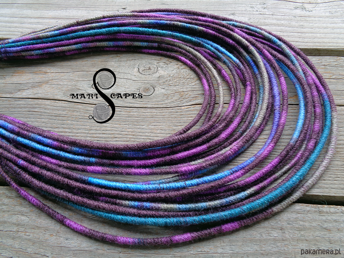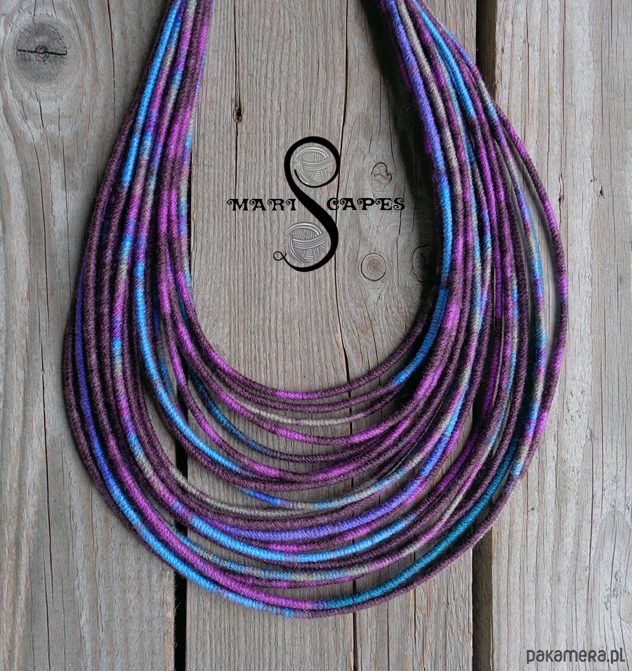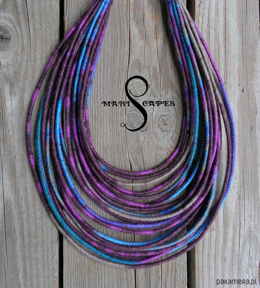 Unikalny naszyjnik w stylu etnicznym / afrykańskim z wymyślonej przeze mnie oryginalnej serii włóczkowych "Masajek". Długość ok. 45-65 cm Stworzony z połączenia wielu długich, nieco sztywnych sznurków, pieczołowicie ręcznie owiniętych miękką włóczką w odcieniach fioletu i turkusu. Wielowarstwowe kolorowe pasemka przywołują w pamięci masajskie ozdoby.