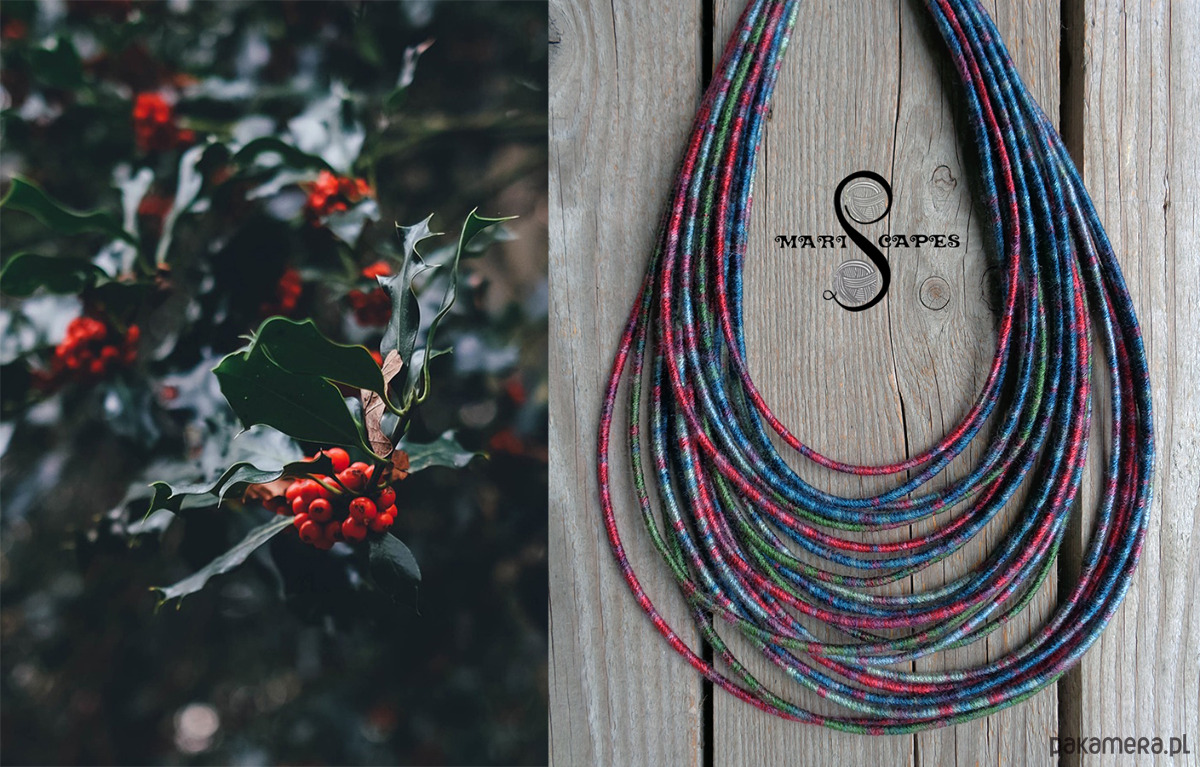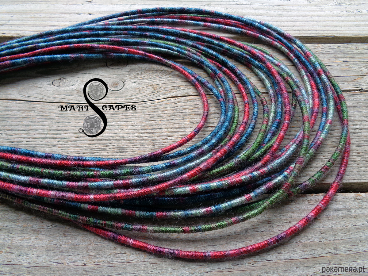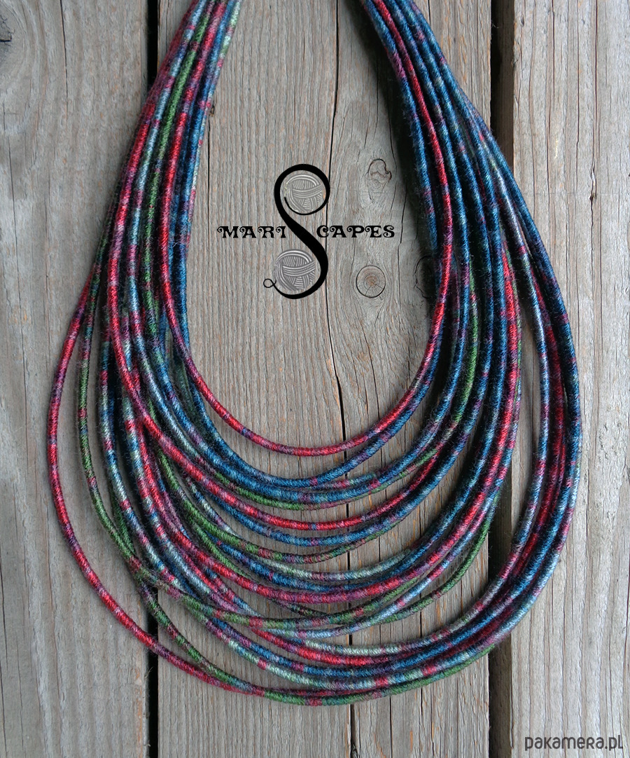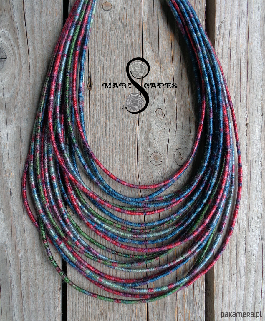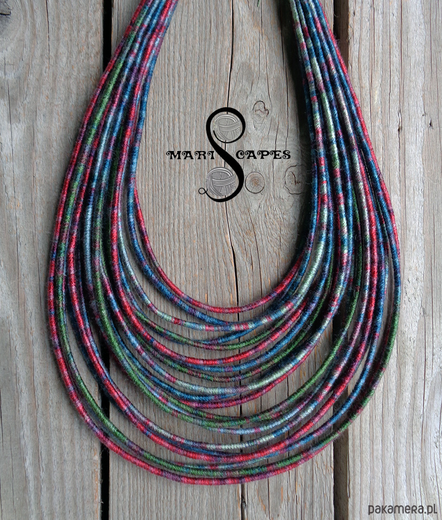 Unikalny naszyjnik w stylu etnicznym / afrykańskim z wymyślonej przeze mnie oryginalnej serii włóczkowych "Masajek". Długość ok. 45-65 cm Stworzony z połączenia wielu długich, nieco sztywnych sznurków, pieczołowicie ręcznie owiniętych miękką, non-alergiczna włóczką akrylową w spokojnych, jesiennych odcieniach. Wielowarstwowe kolorowe pasemka przywołują w pamięci masajskie ozdoby.
