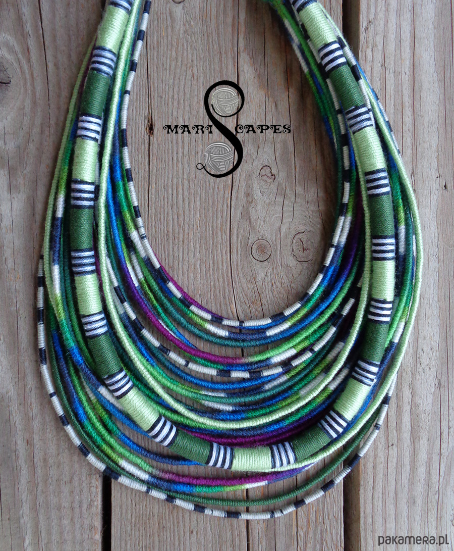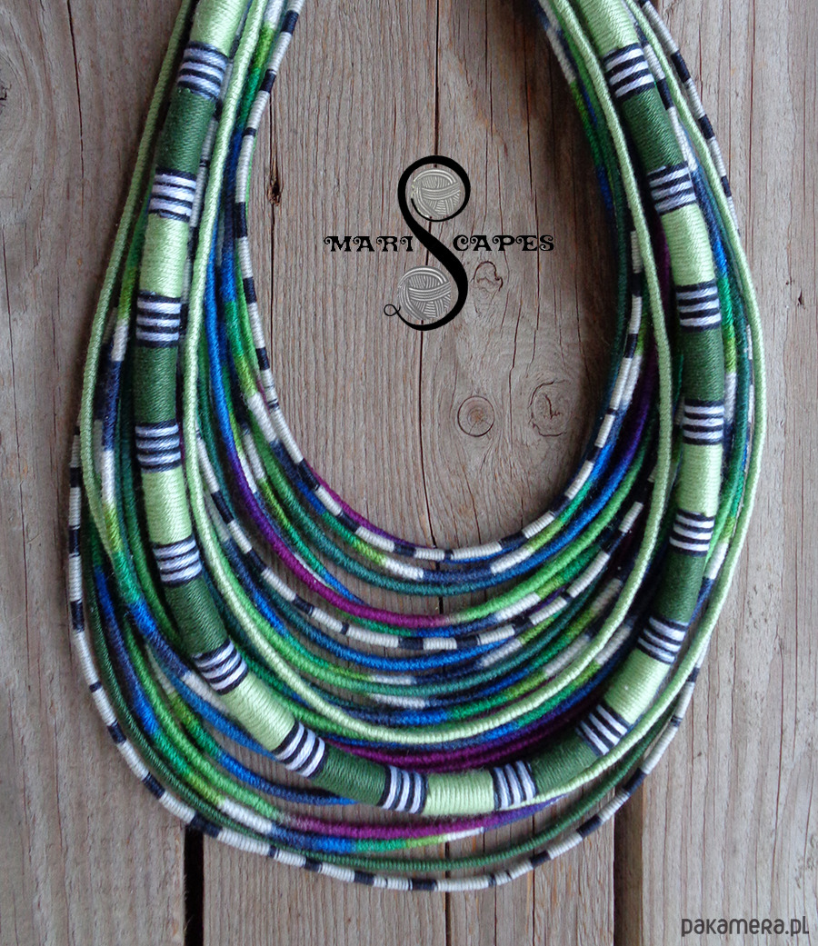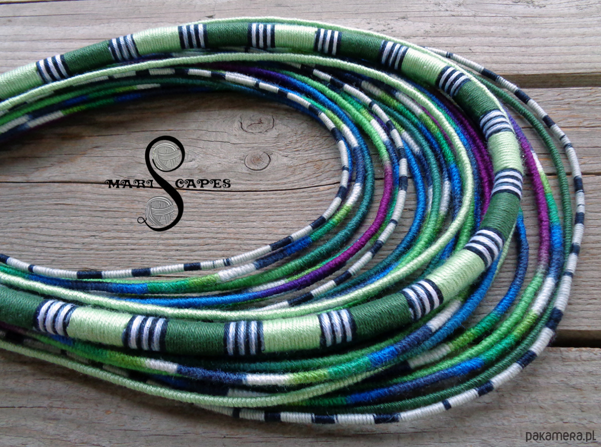 Unikalny naszyjnik w stylu etnicznym / afrykańskim z wymyślonej przeze mnie oryginalnej serii włóczkowych "Masajek". Długość ok. 45-65 cm Stworzony z połączenia wielu długich, nieco sztywnych sznurków, pieczołowicie ręcznie owiniętych miękką włóczką w soczystych odcieniach morskiego turkusu, zieleni, fioletu i kobaltu, z odrobina bieli. Z grubszą liną. Wielowarstwowe kolorowe pasemka przywołują w pamięci masajskie ozdoby.