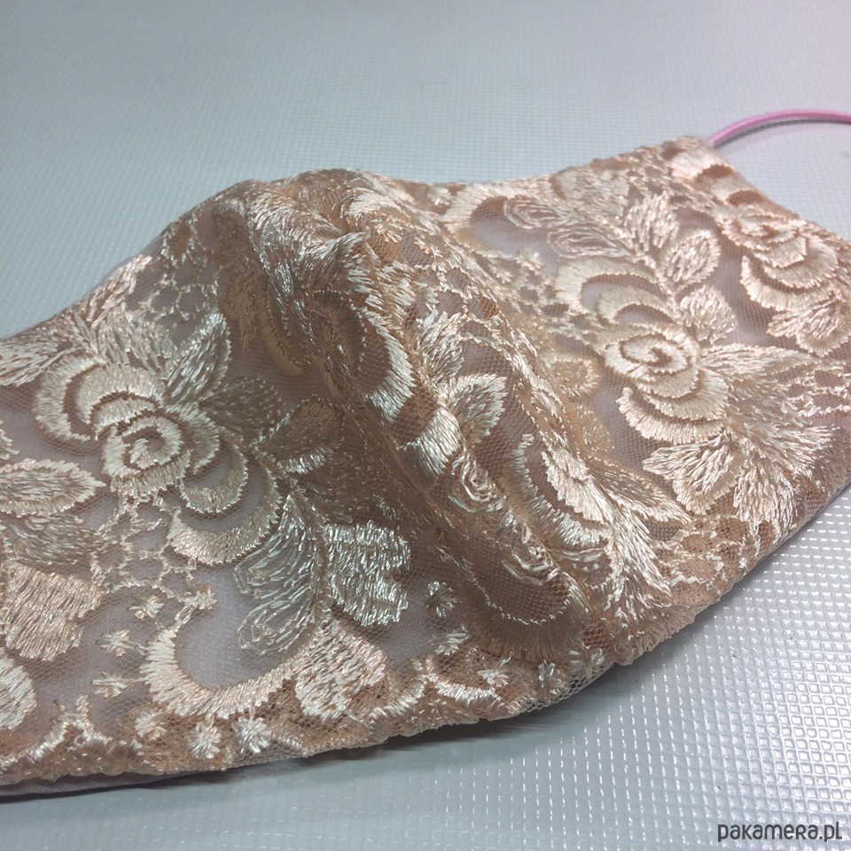Maseczka uszyta z koronki i z drugiej strony z jedwabiu- dwustronna. Mocowane na gumkach.