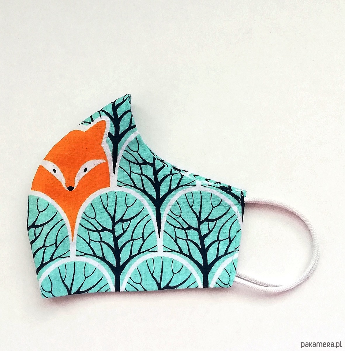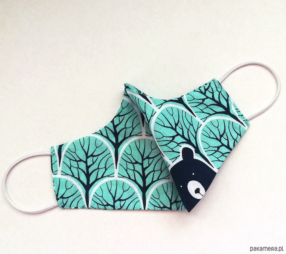 Staranne uszycie maseczki pozwala na noszenie jej na dowolną stronę - wewnątrz granatowy misiek.