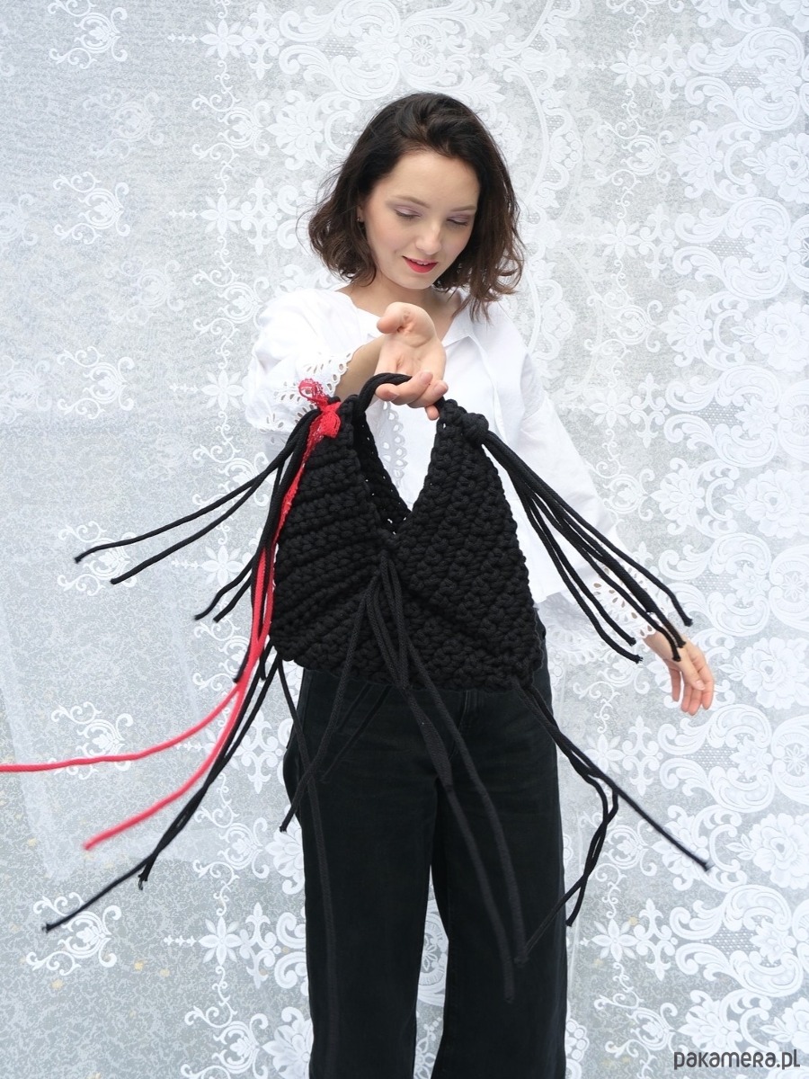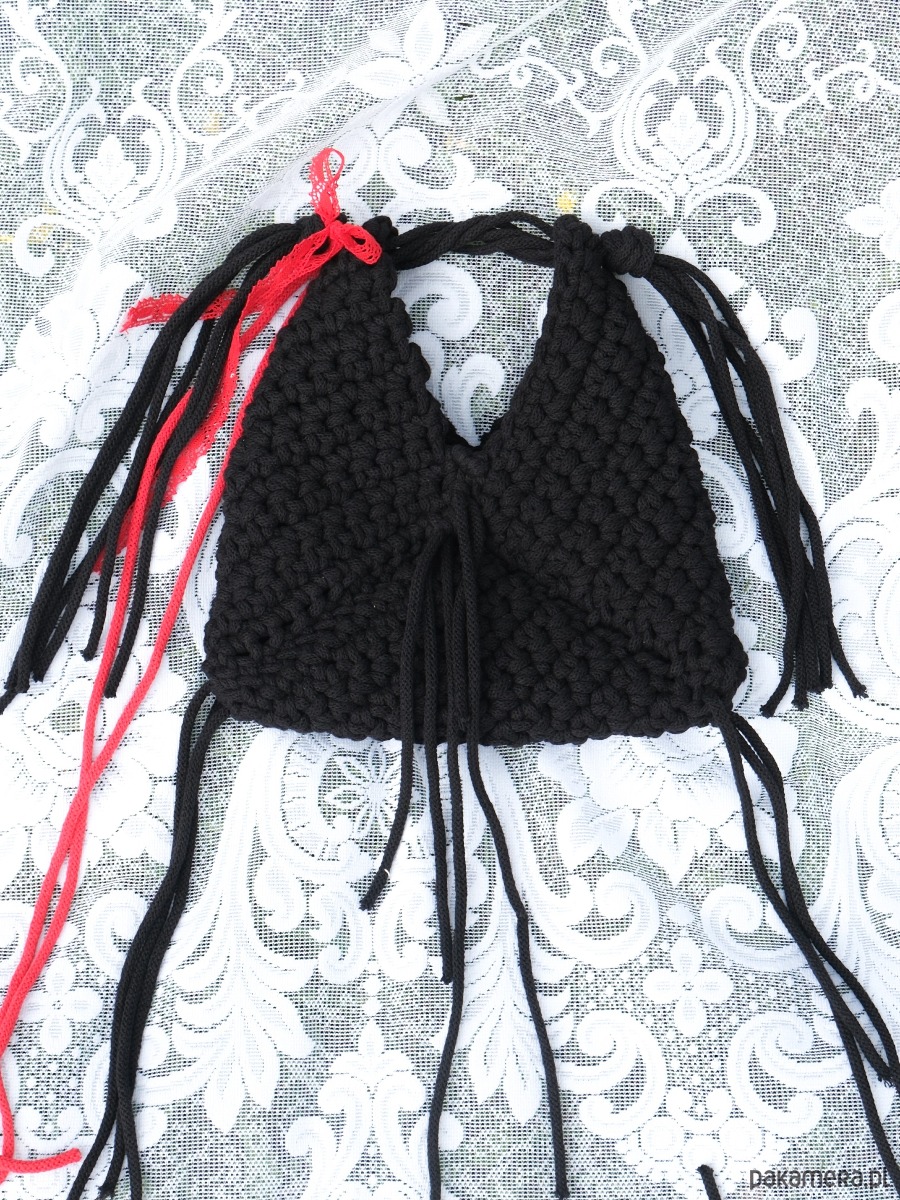 Czarna Torebka ze Sznurka Bawełnianego z Recyklingu z Frędzlami