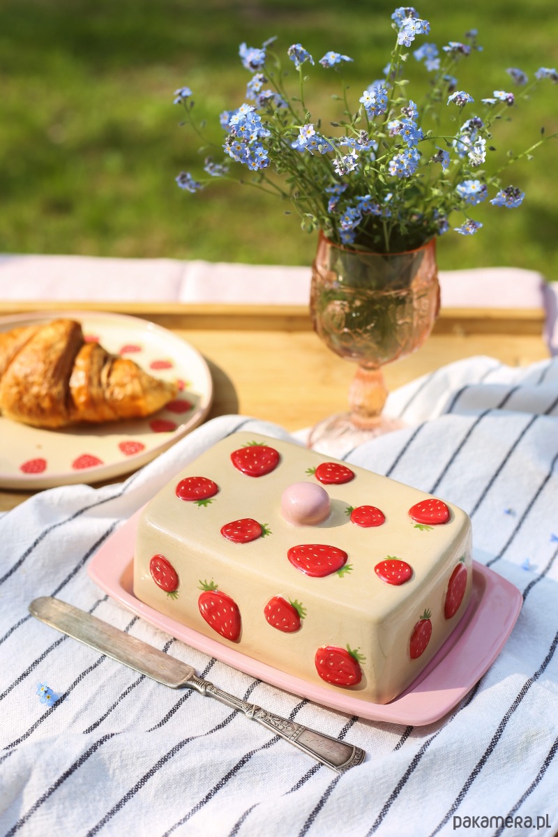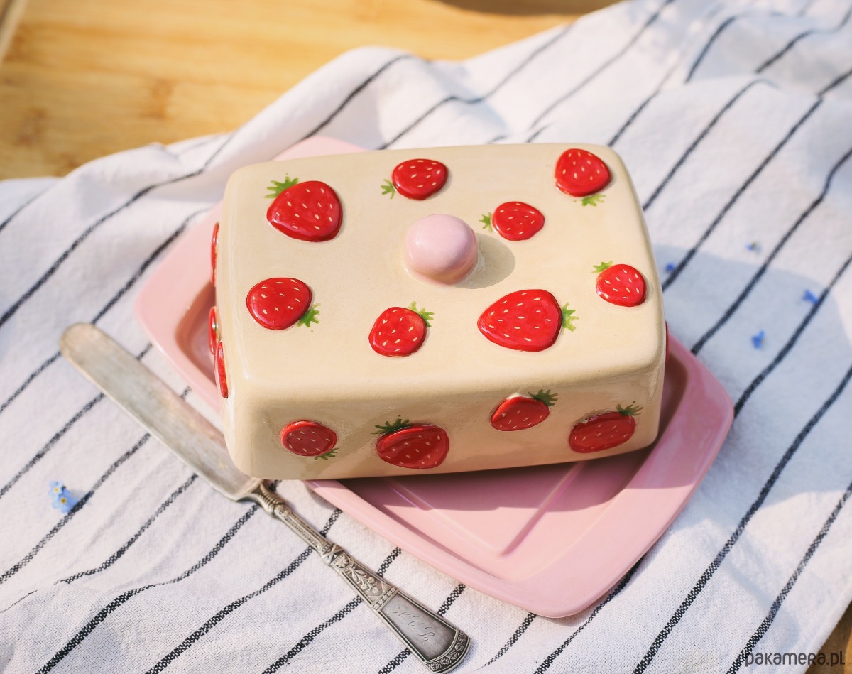 Ceramiczna maselnica w odręcznie przyklejane i malowane truskawki. Podstawka maselnicy w różowym kolorze.Ręcznie malowana szkliwami bezpiecznymi do kontaktu z żywnością.