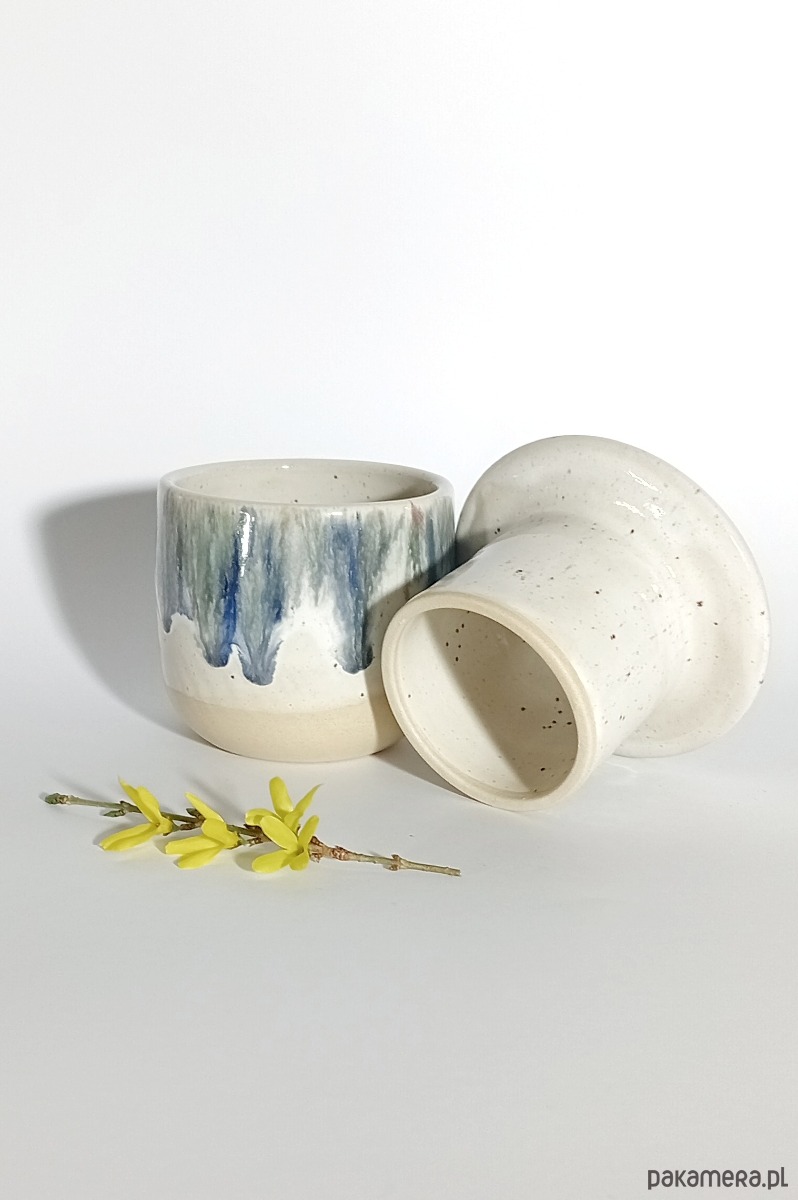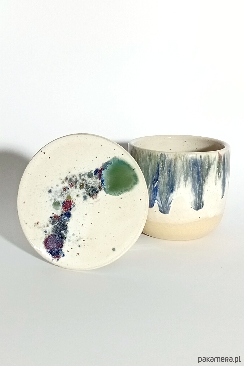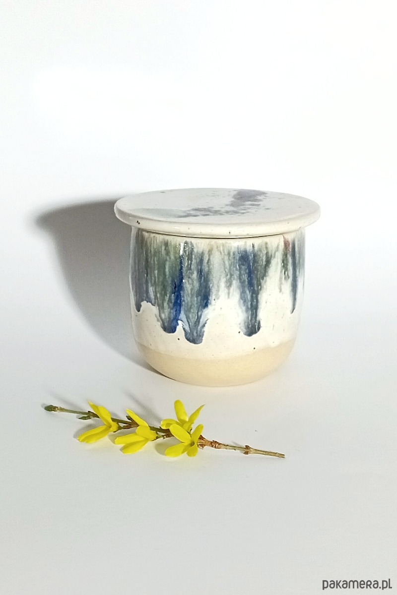Ręcznie tworzona maselnica tradycyjna do przechowywania masła w wodzie w delikatne kropki i kolorowe spłynięcia. Spód gładki, by nie niszczył powierzchni, wypalany w prawidłowej temperaturze.