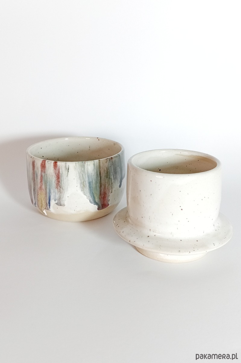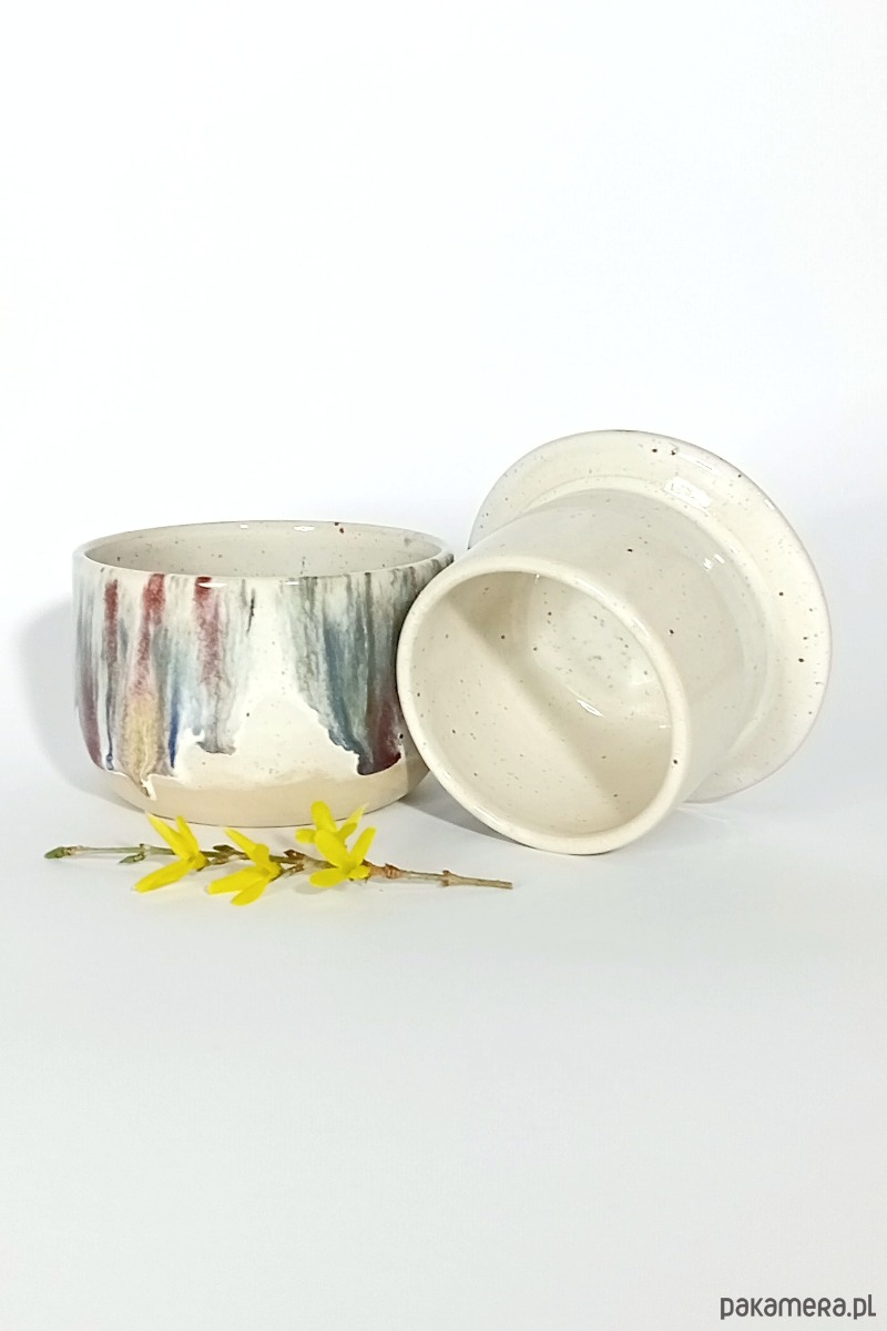 Ręcznie tworzona maselnica tradycyjna do przechowywania masła w wodzie w delikatne kropki i kolorowe spłynięcia. Spód gładki, by nie niszczył powierzchni, wypalany w prawidłowej temperaturze.