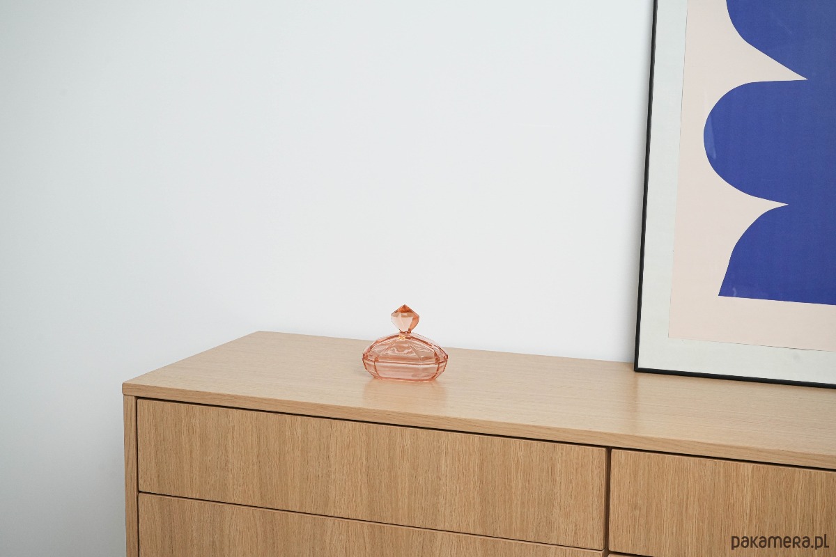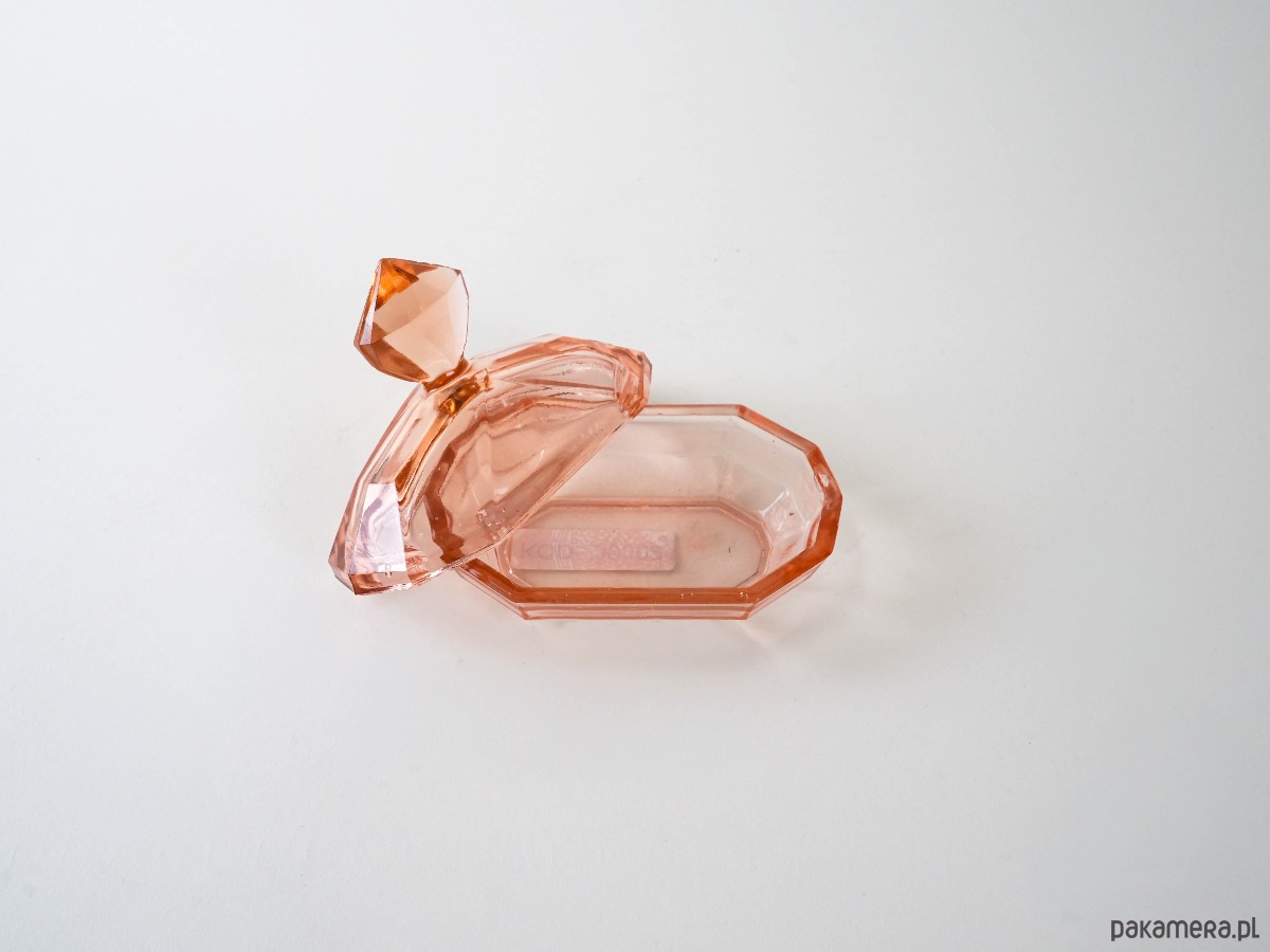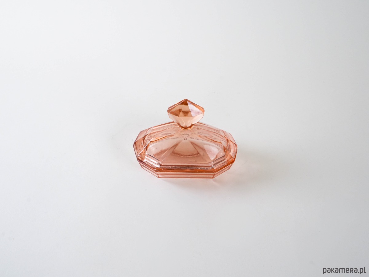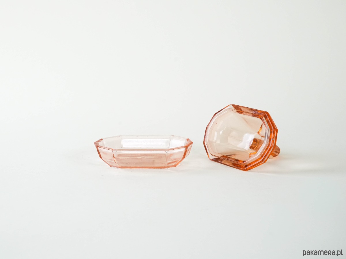 Geometryczna maselniczka z różowego szkła prasowanego w stylu art déco. Otwierana, z dekoracyjnym uchwytem w kształcie diamentu. Stylowa forma i charakterystyczne szlify wskazują na produkcję europejską z lat 30. XX wieku.