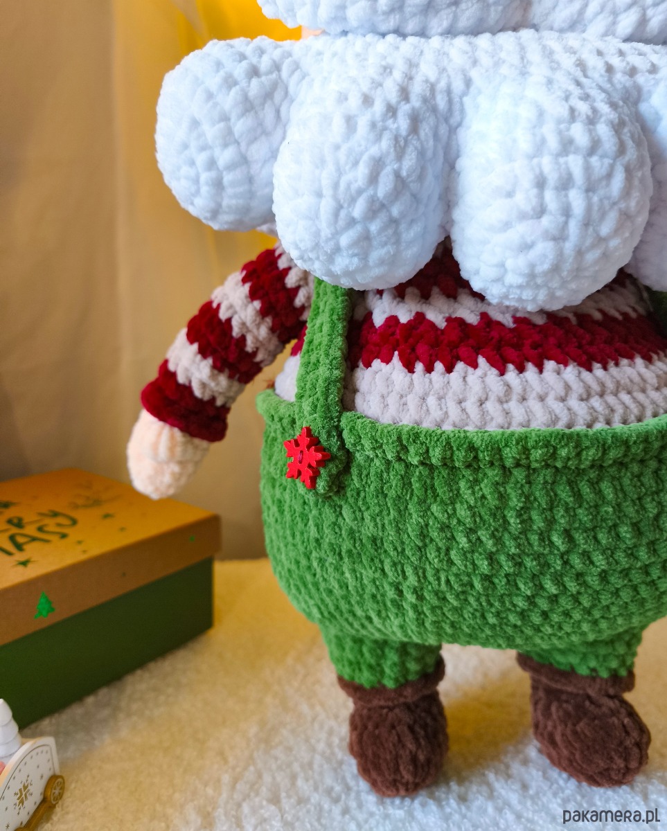 - Kolorystyka - białe wąsy, broda i brwi, zielone spodnie, brązowe buciki, sweterek w bezowo-bordowe paski, ceglasty beret z mlecznym pomponem.