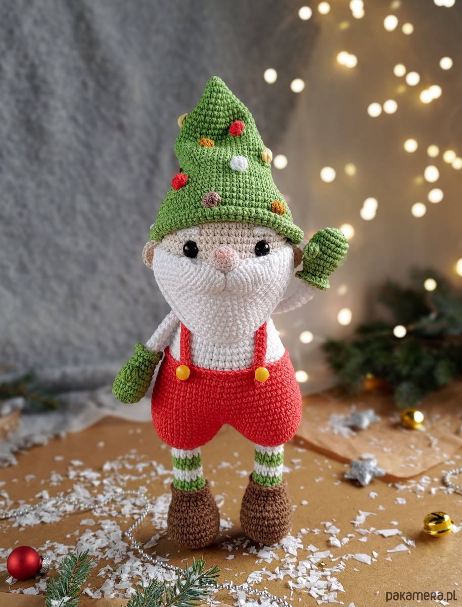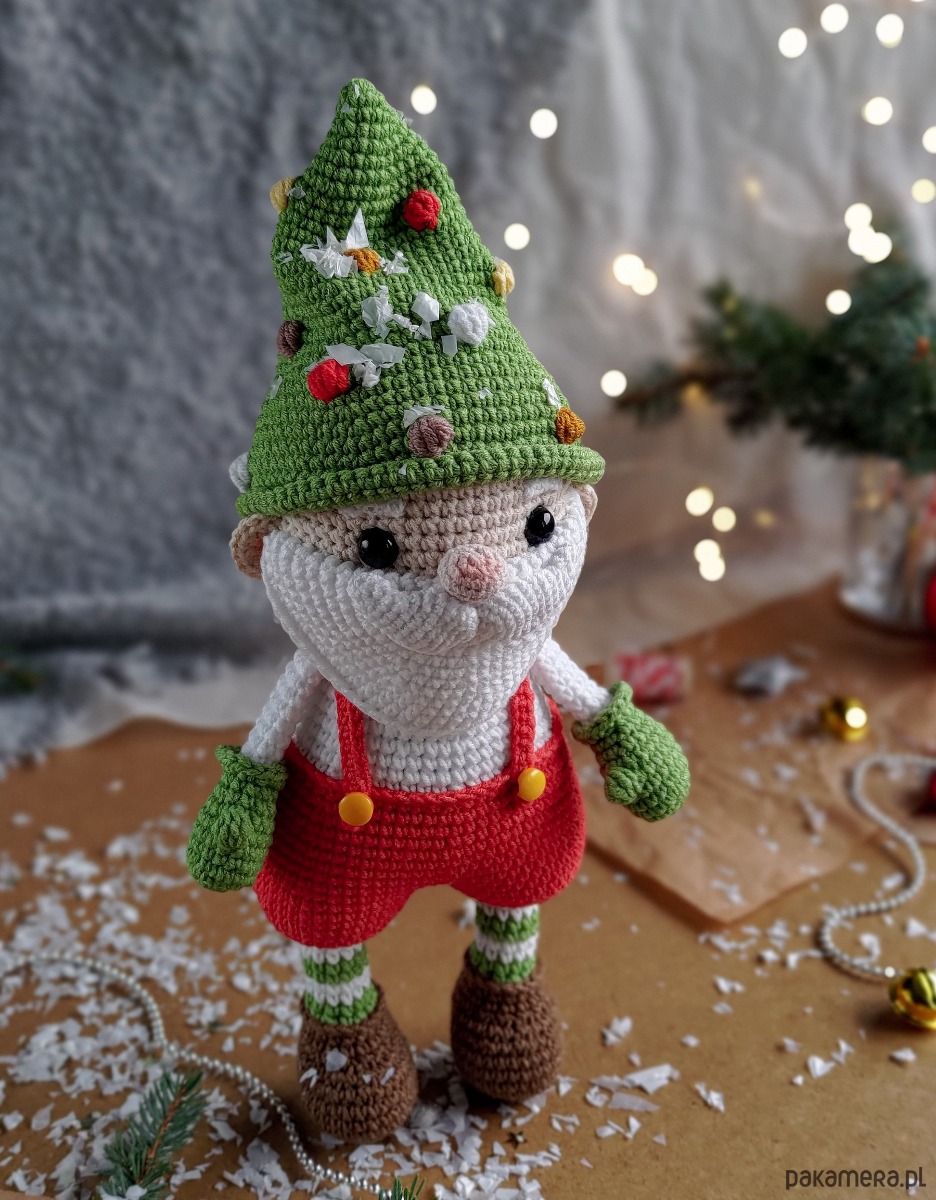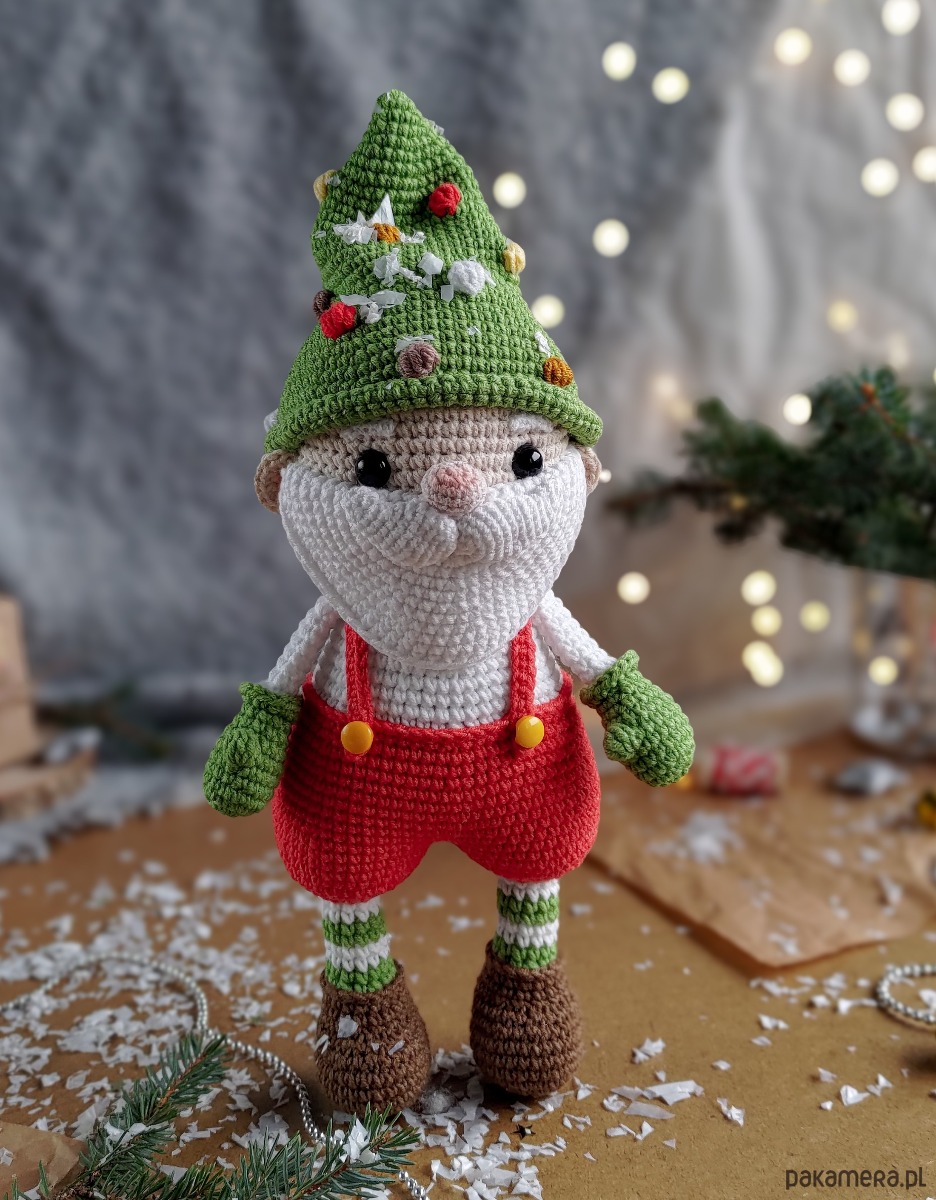 • Dziadek ubrany jest w białą koszulą, czerwone spodnie, brązowe buciki, zielone rękawiczki i zieloną czapką z kolorowymi pomponami.