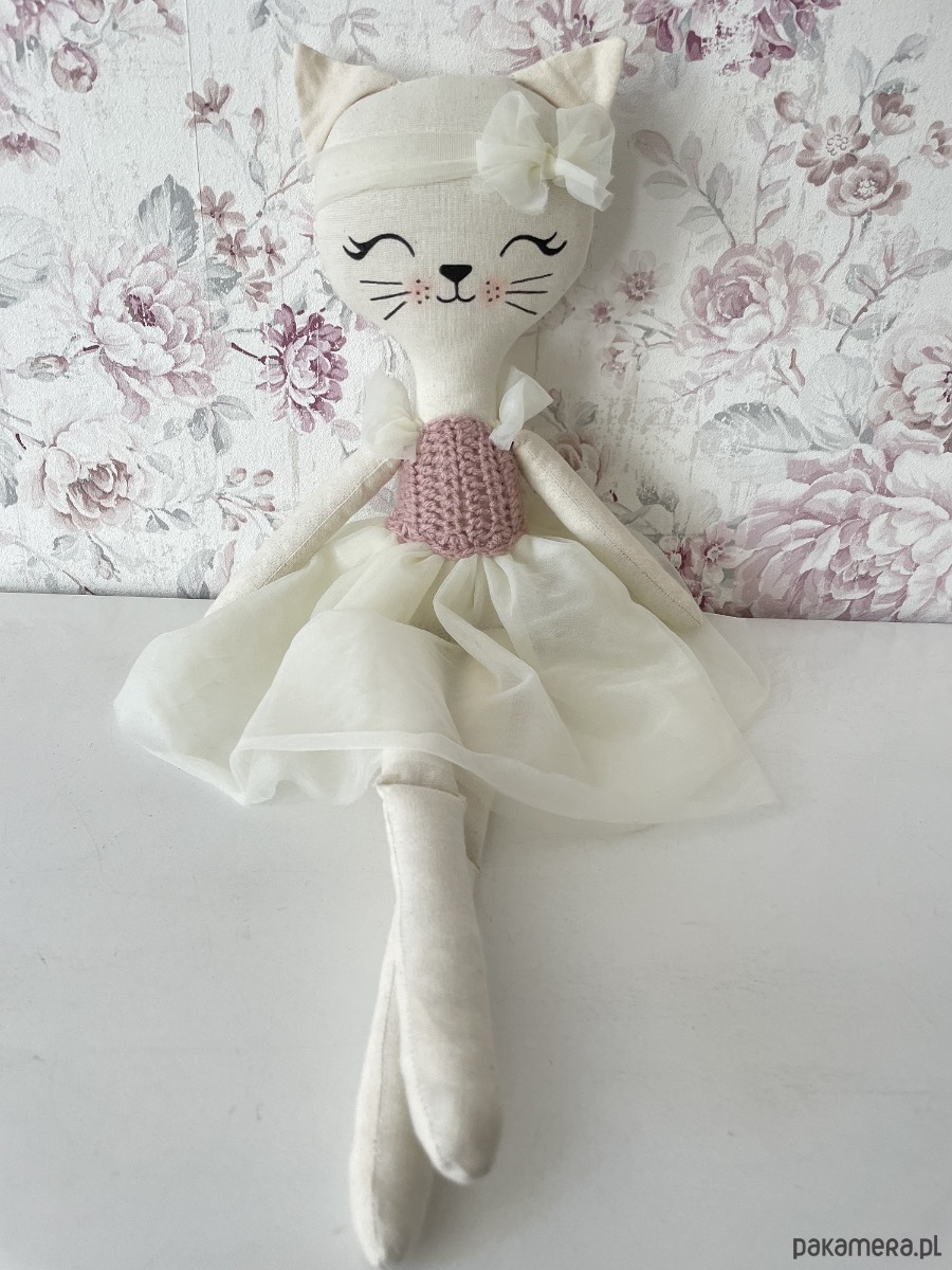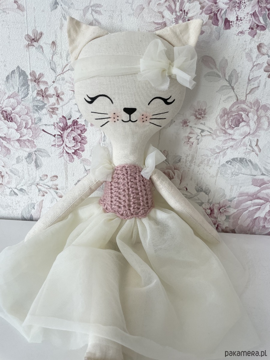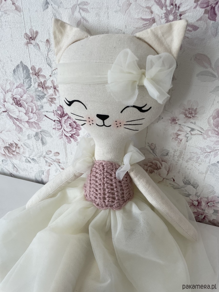 Kotek ma ręcznie malowaną buźkę, która pozostanie idealna nawet po praniu.