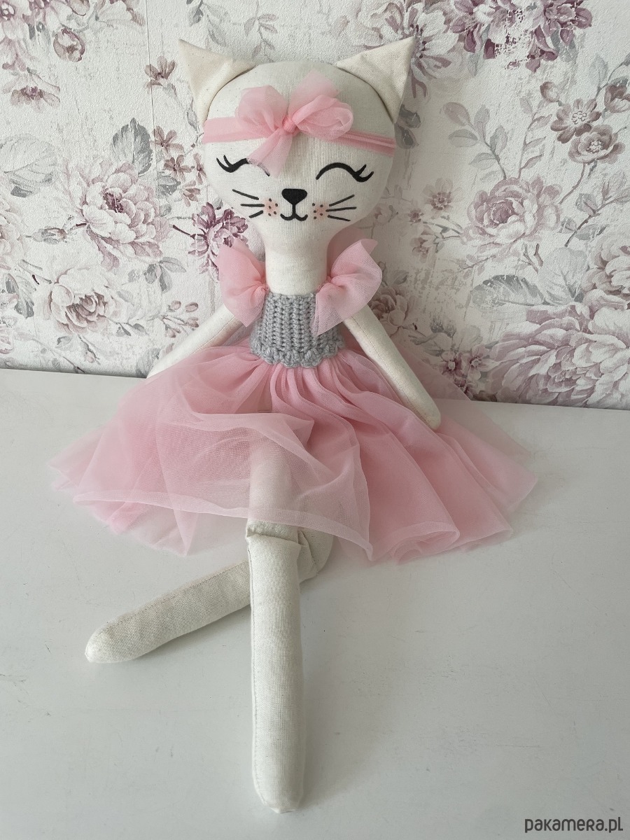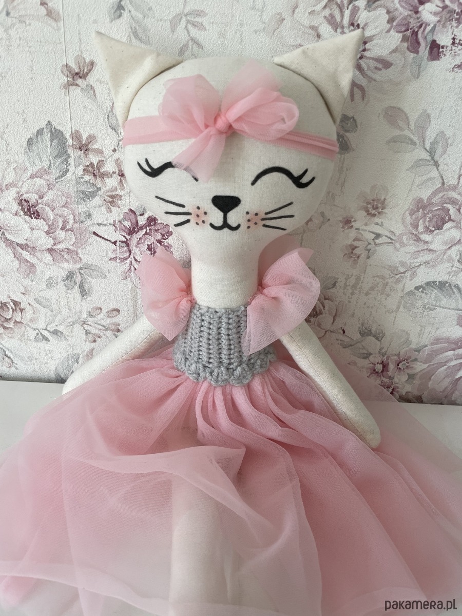 Kotek ma ręcznie malowaną buźkę, która pozostanie idealna nawet po praniu.